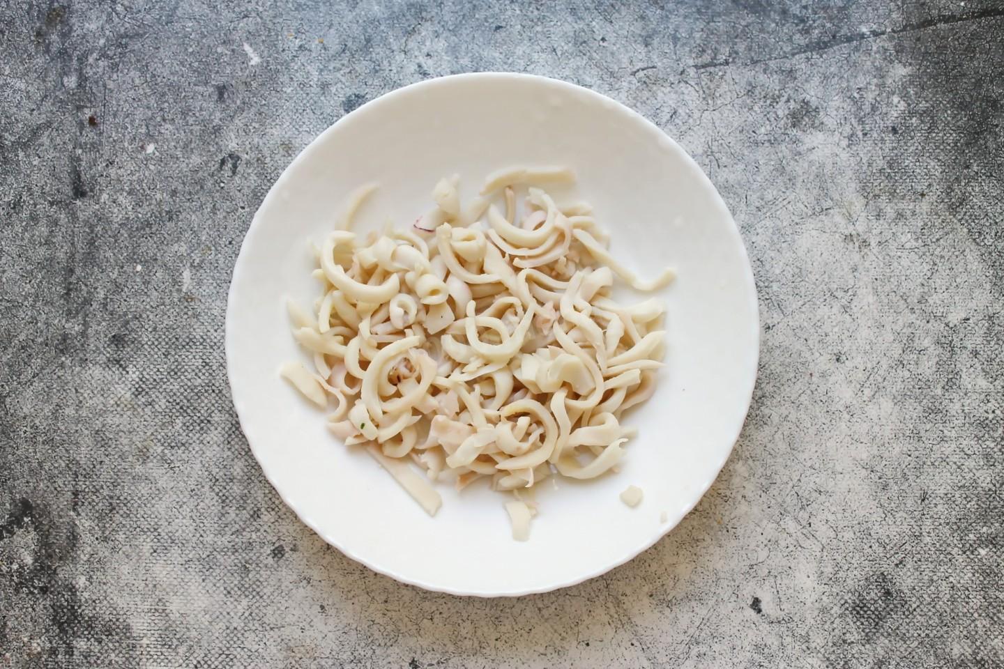 Тушки кальмаров обдайте горячей водой и очистите от верхнего слоя и тонкой пленки. Тушки выверните, удалите жесткую часть, облейте горячей водой и так же почистите, удаляя пленку. В кастрюлю налейте воду и доведите до кипения на среднем огне, положите тушки. После закипания варите кальмары 1-2 минуты и откиньте на сито. Облейте кальмары холодной водой, чтобы остановить приготовление. Дайте воде стечь и остудите. Порежьте кальмары тонкой соломкой.