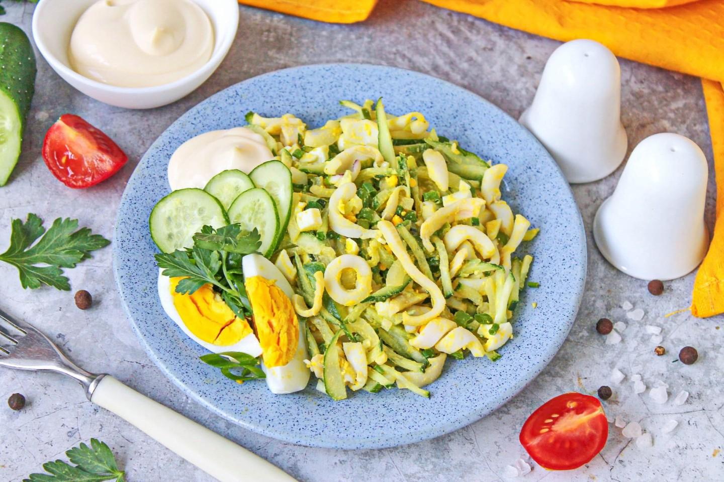 Салат из кальмаров классический советский с яйцом и огурцом готов. Приятного аппетита!