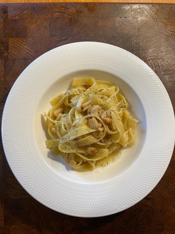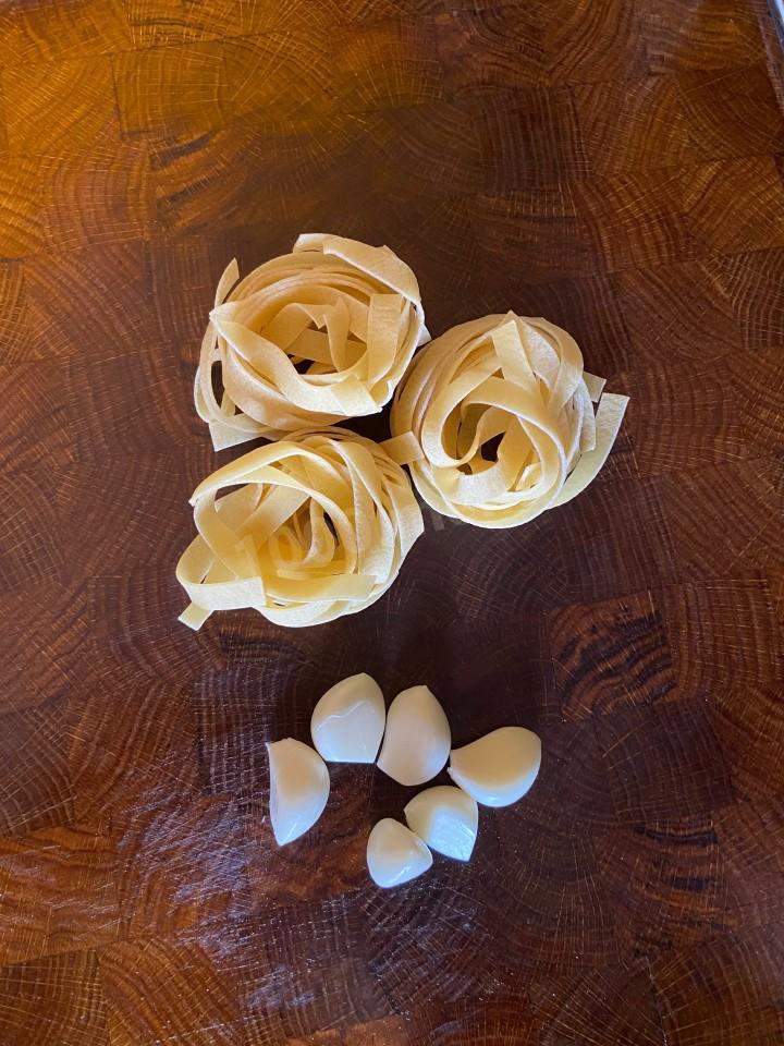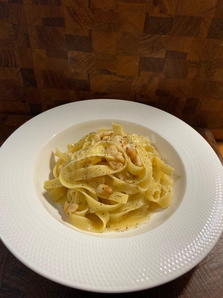 Приготовления этого блюда начинаете с того, что отвариваете пасту в подсоленной воде до состояния «аль денте». Можно использовать спагетти , тальятели , в моем случае фетучини. Обычно на 100 граммов сухой пасты 1 литр воды и 10 граммов соли.