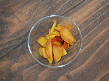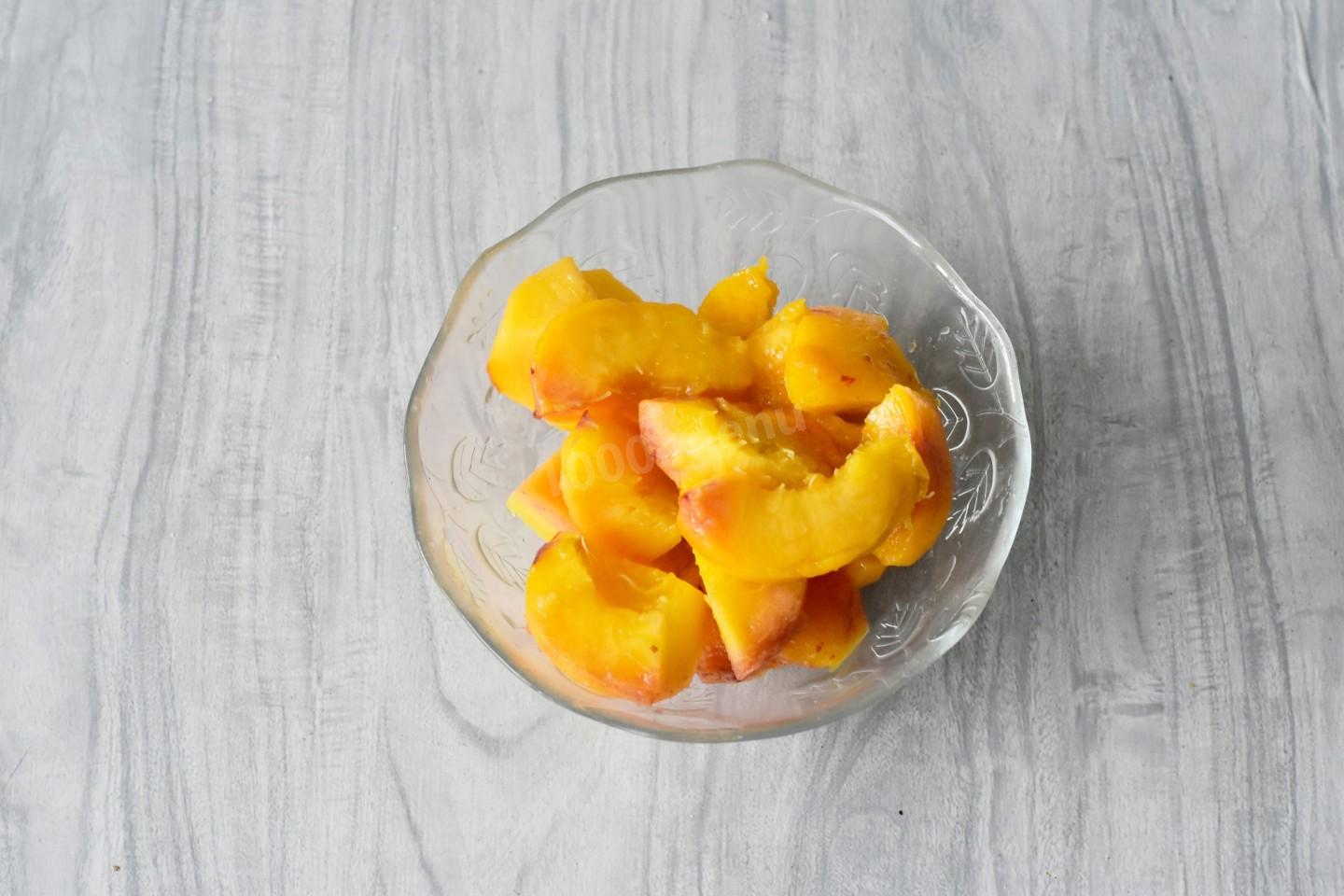 Персики разрежьте пополам и удалите косточку. Каждую половинку очистите от кожуры и нарежьте ломтиками. Персики берите спелые и сладкие. Сладости персиков вполне хватит для этого десерта. Но по желанию можете добавить сахар, мед или любой подсластитель по вашему вкусу. Персики можете заменить на нектарины, а также другие ягоды или фрукты по вашему вкусу.