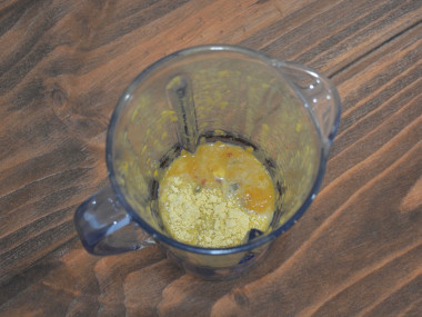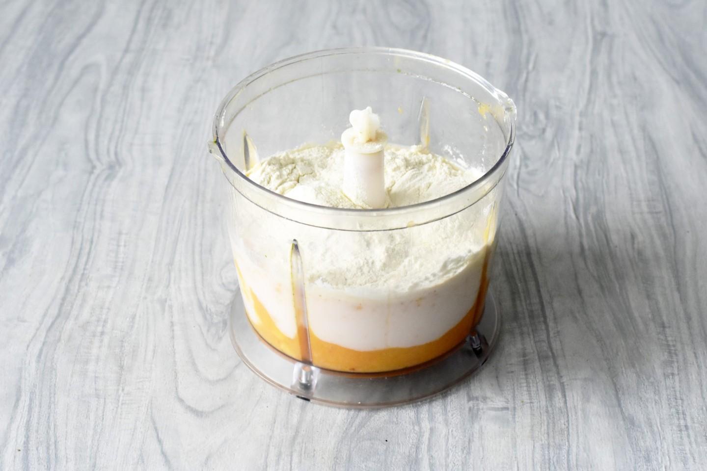 Влейте к персиковому пюре кокосовое молоко, всыпьте протеин. Снова взбейте до однородности. Я использовала готовую смесь (сывороточный + соевый протеин) с ароматизатором "Ваниль". Можно использовать чистый протеин (сывороточный, соевый, яичный) или их смесь без добавок и добавить ванилин по вкусу. Можно протеин с другими ароматизатором. Например, персиковый протеин усилит вкус и аромат персиков в десерте, кокосовый - кокоса.