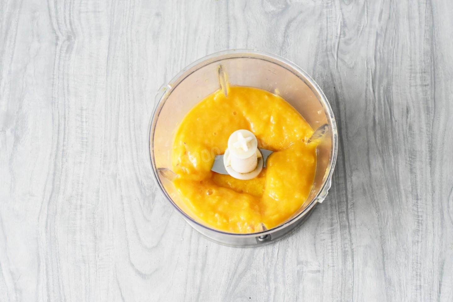 В чашу блендера выложите персики и взбейте до получения однородного пюре. Вместо стационарного блендера можете использовать погружной.