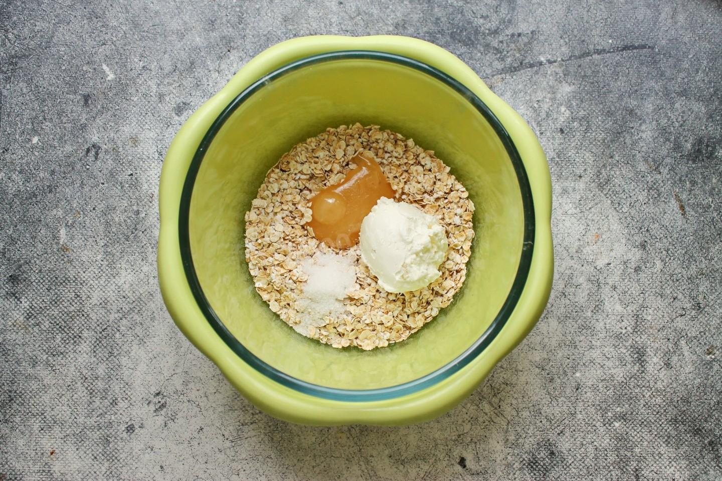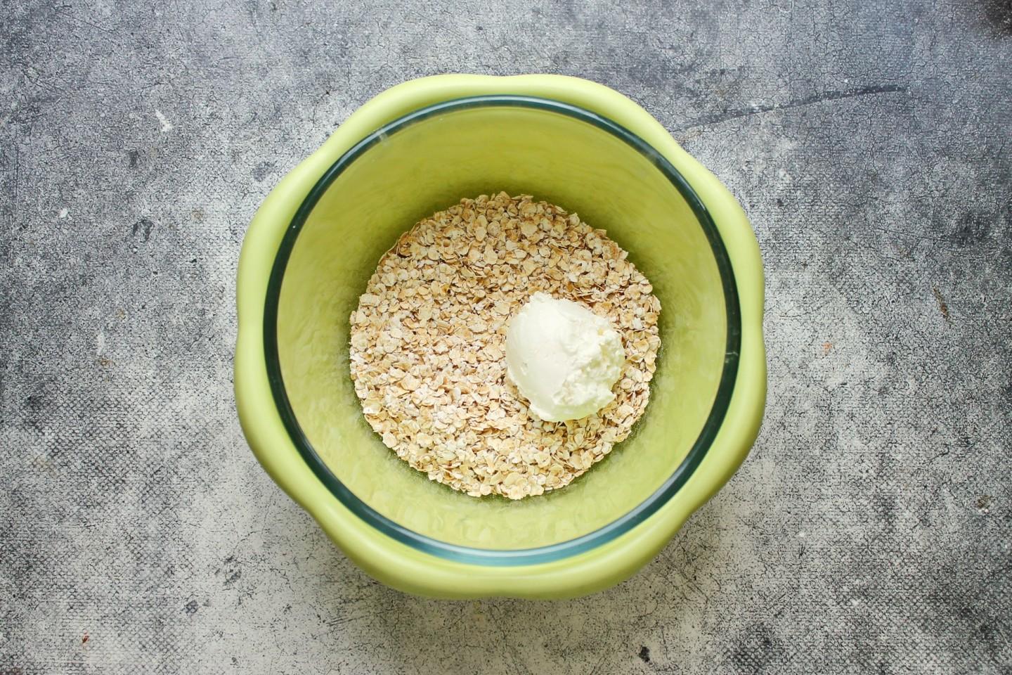 В миску всыпьте овсяные хлопья и добавьте маскарпоне. Хлопья лучше всего взять мелкие и быстрого приготовления. В этом случае основа получится более нежной. А чтобы не ошибиться с выбором прочитайте статью об овсяной крупе и геркулесе под рецептом. Если для вас маскарпоне слишком жирный сыр, его можно заменить на другой. Как это сделать правильно и не испортить блюдо можно прочитать в статье под шагами.