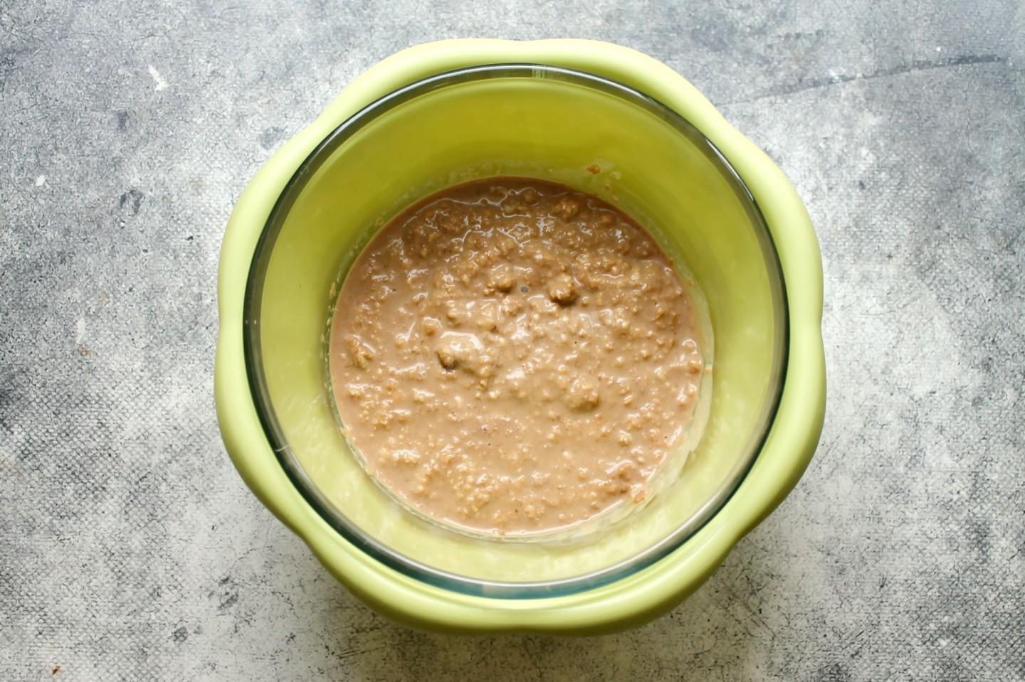 В теплое молоко добавьте кофе и перемешайте до растворения. Влейте кофейное молоко в овсяную массу и тщательно перемешайте.