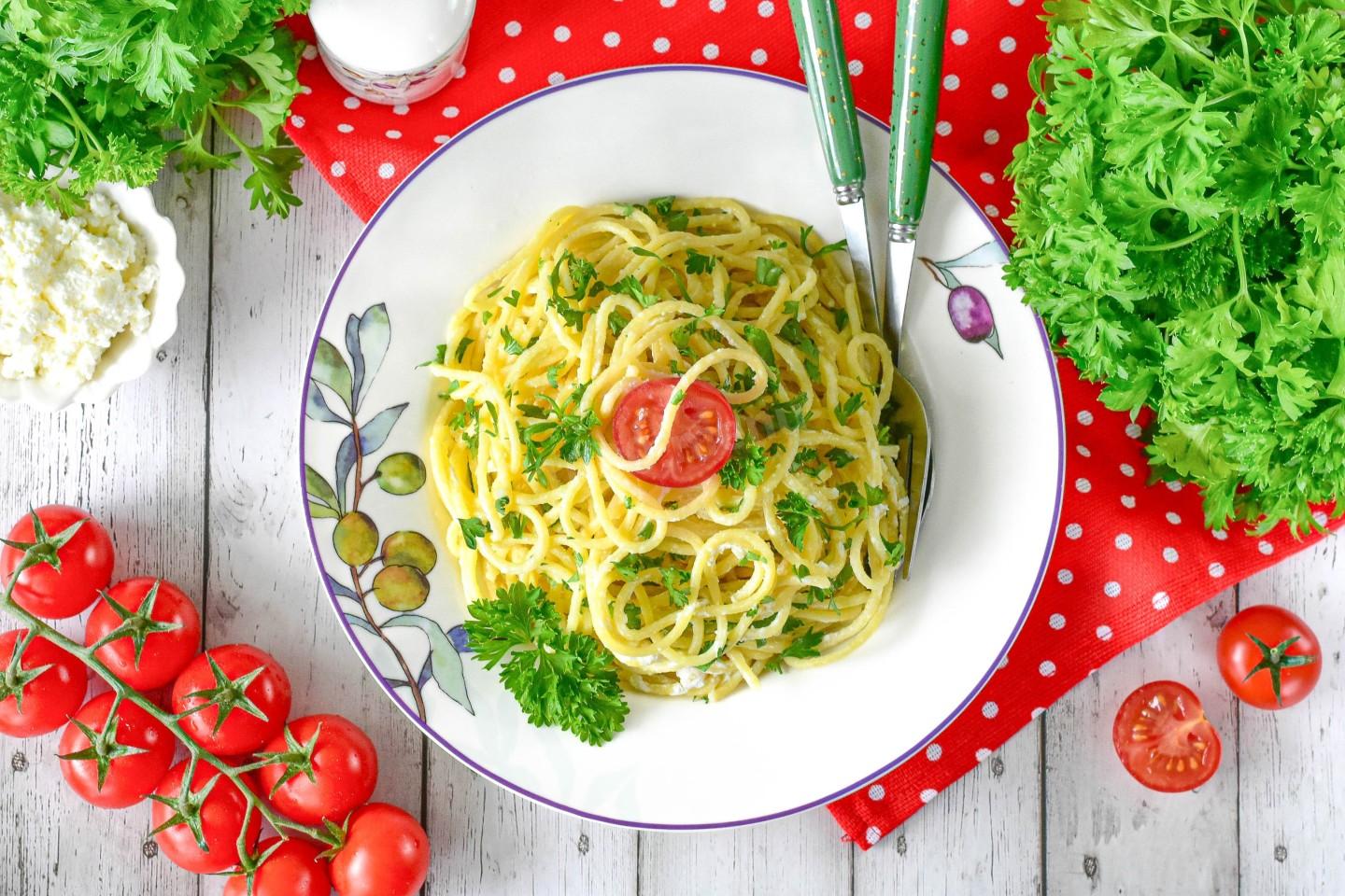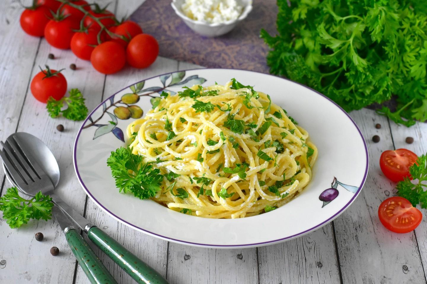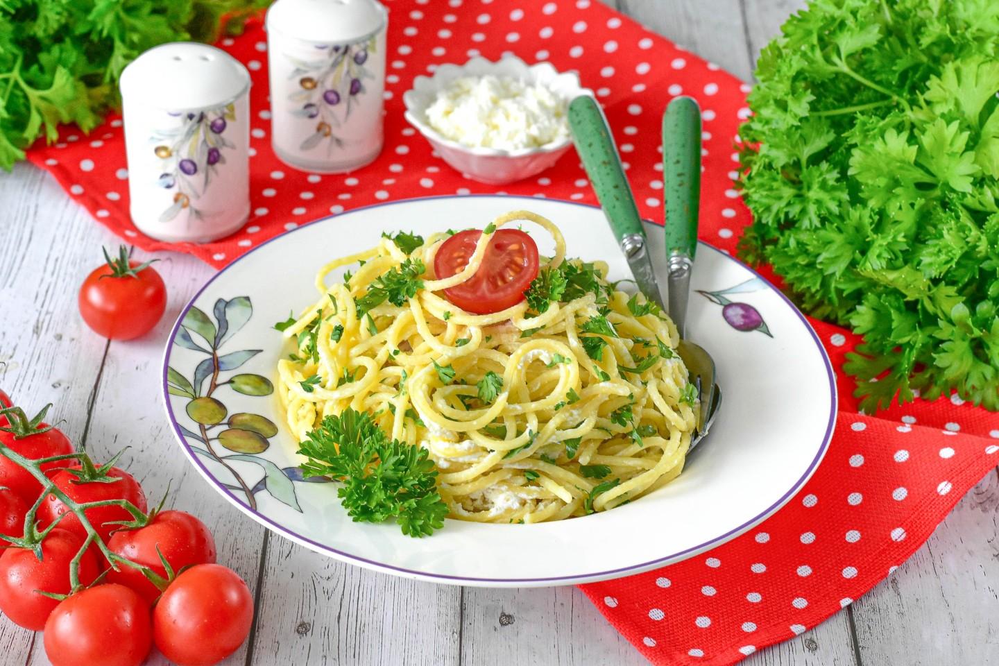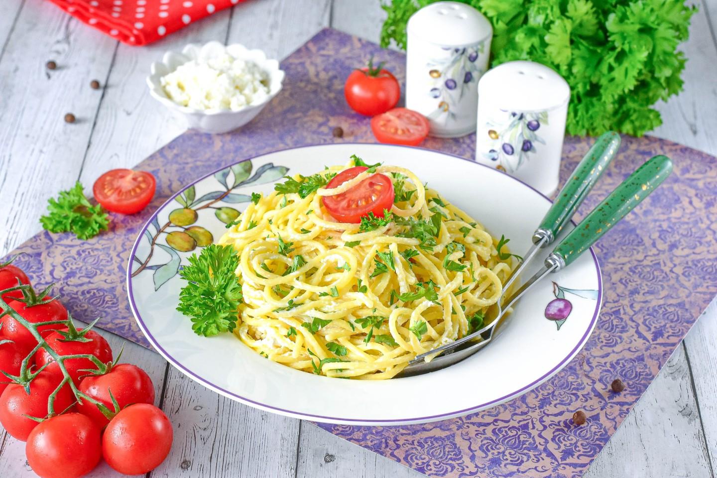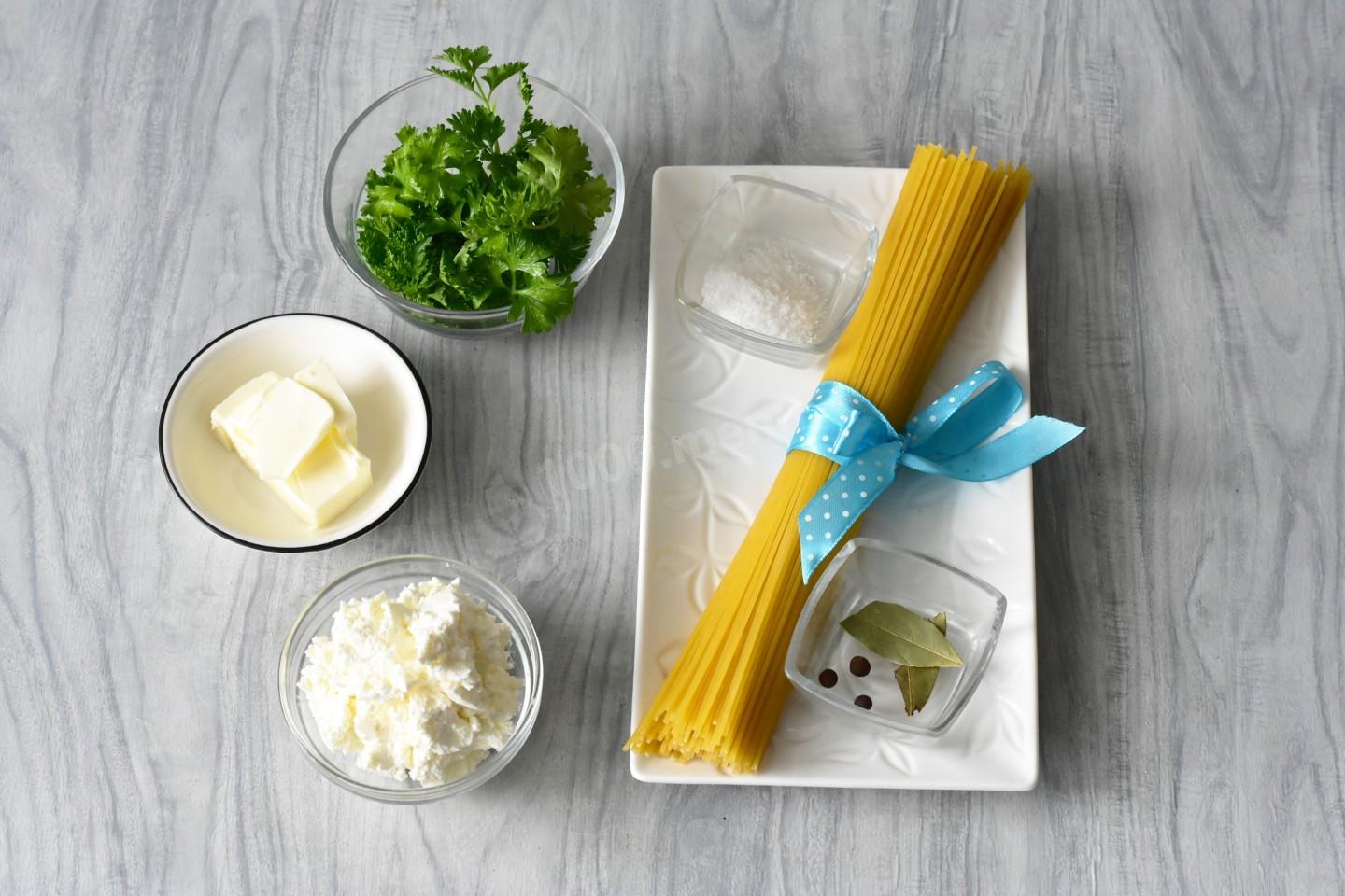Как сделать макароны с творожным сыром? Подготовьте необходимые ингредиенты. Для пасты подойдут любые макароны: длинные (спагетти, феттуччини, лингвини) или средние (пенне, фарфалле, фузили, и др.). Я остановилась на спагетти. Подробнее о тонкостях выбора макарон читайте в отдельной статье, ссылка в конце рецепта.