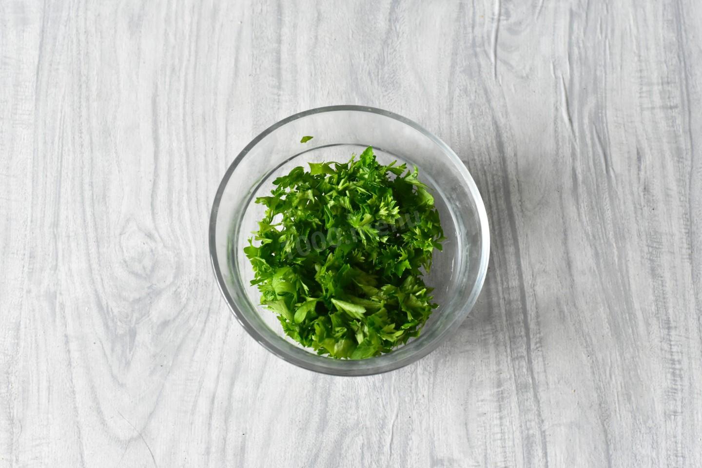 Петрушку вымойте, обсушите и мелко порубите. По желанию можете заменить или дополнить другой зеленью, например,базиликом, кинзой, укропом или использовать смесь разных трав.