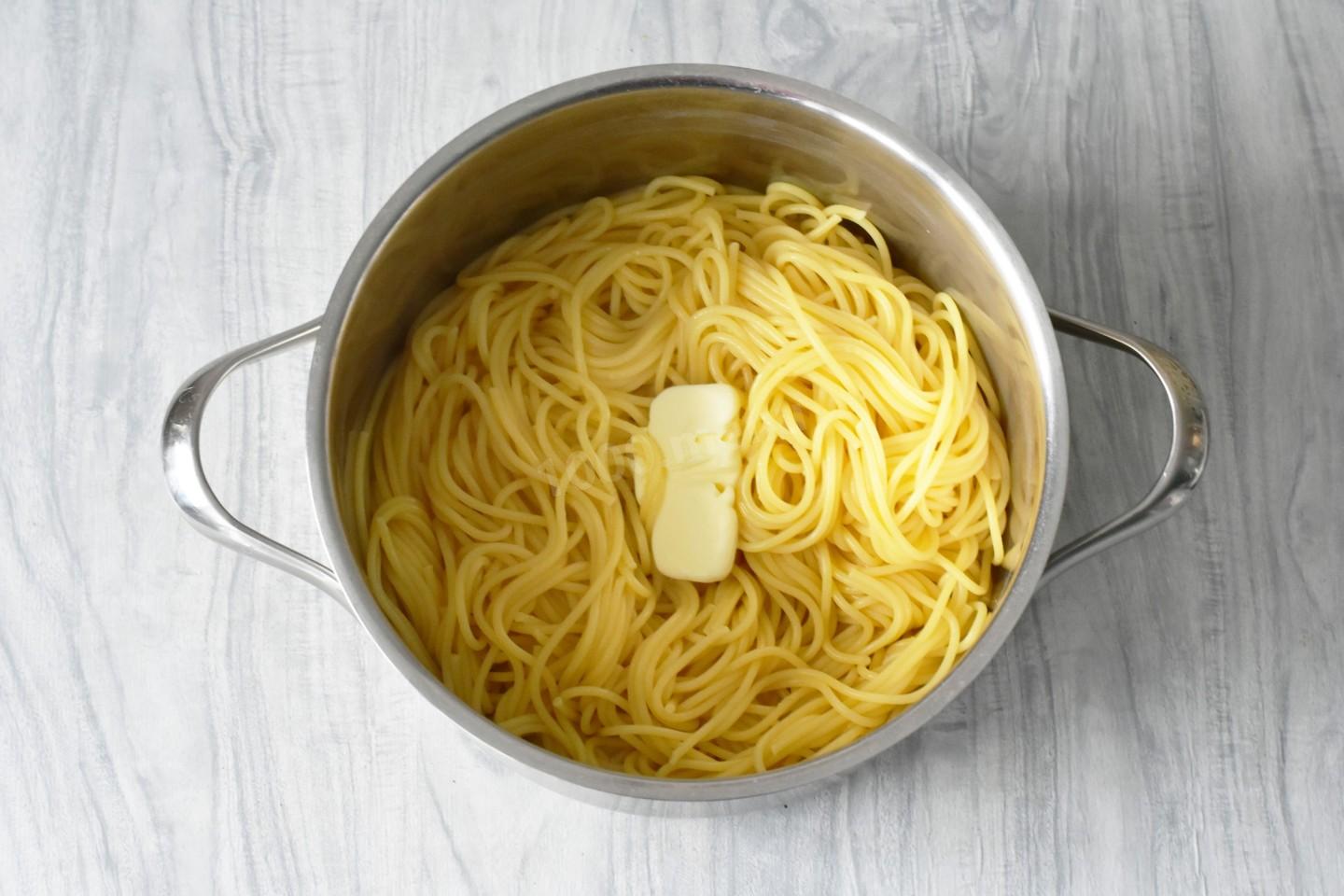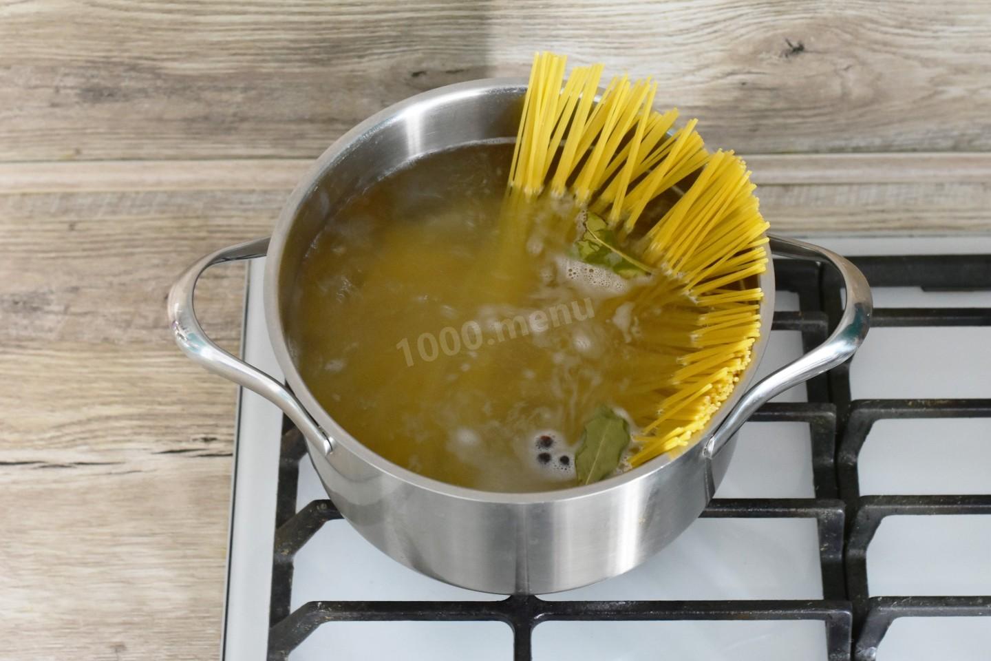 Выложите в воду спагетти и отварите до состояния al dente примерно 7-8 минут (на одну минуту меньше, чем указано на упаковке). Воду слейте. Если у вас другие виды пасты, то время варки может отличаться - смотрите инструкцию на упаковке.