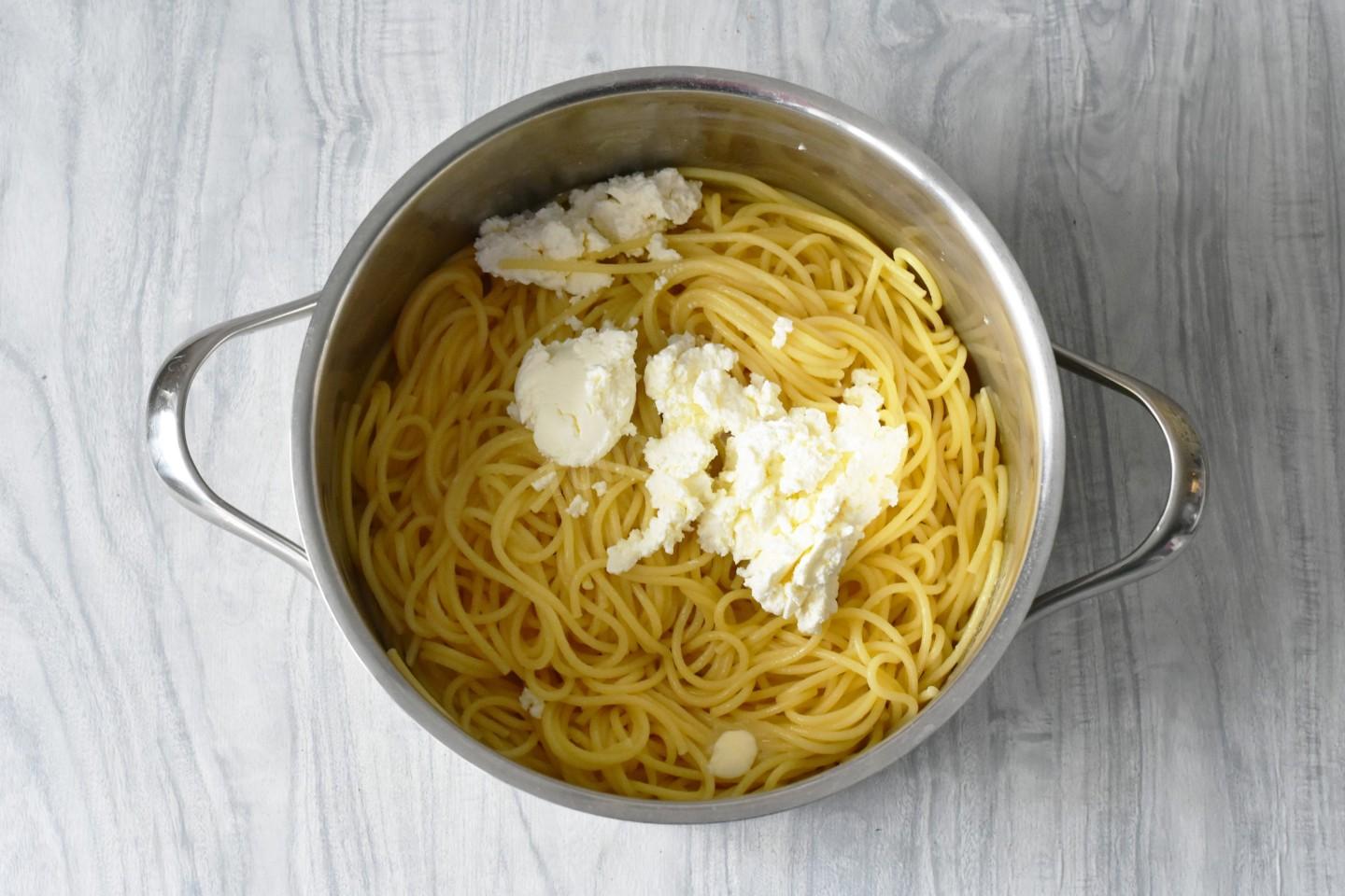 Добавьте творожный сыр и перемешайте, чтобы сыр расплавился и равномерно разошелся по всей пасте. Творожный сыр можете заменить на плавленый, рикотту, маскарпоне и т.д. О различных видах сыров читайте в статье в конце этого рецепта под шагами.