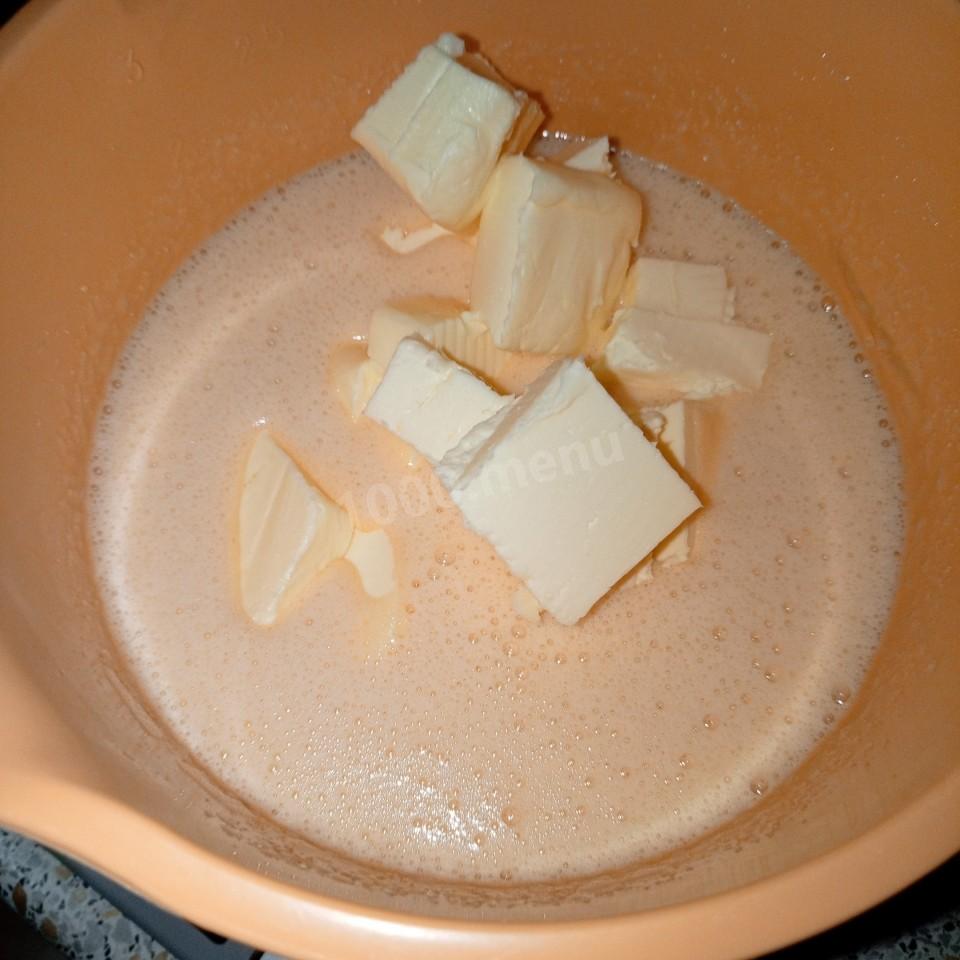 Масло предварительно достаньте из холодильника. Сливочное масло размягченное отправляем к яйца и все очень хорошо перемешиваем миксером. Масло может стать комочками но это не страшно, когда добавите муку , все комочки и разойдутся .