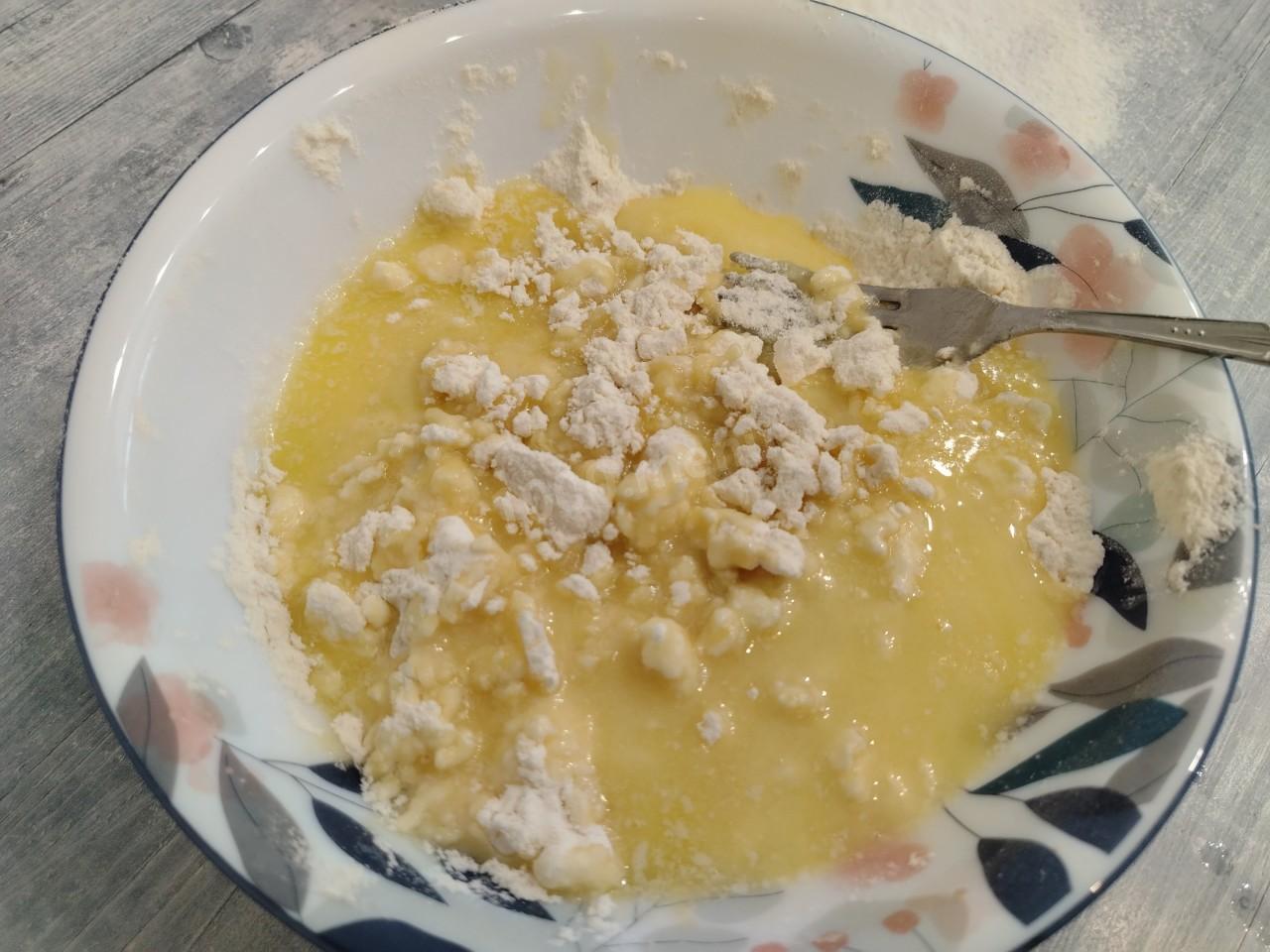В творог добавьте растопленное сливочное масло и просеянную муку. Всё хорошо перемешайте, если нужно, можно ещё добавить муки.