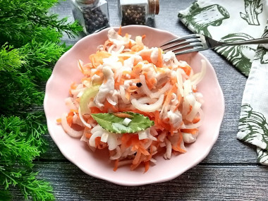 Морковь очистите и натрите на корейской тёрке, так салат будет выглядеть очень красиво и аппетитно. Если корейской тёрки нет, то можно обойтись обычной. В этом случае стоит использовать крупную нарезку. Луковицу очистите и нарежьте полукольцами.