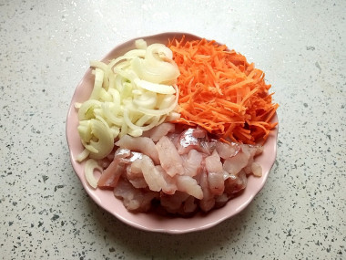 Мне принесли уже срезанное филе. Осталось только хорошо промыть и снять шкурку. Если филе слишком кровянистое, то лучше его вымочить в холодной воде. Шкурку можно и не снимать, но мне нравится без нее. Филе нарезала на длинные кусочки толщиной 4-5 мм. Лука взяла побольше, нарезала полукольцами. А морковку натерла на крупной тёрке. Так всегда делала моя мама. Пропорции маринада взяла такие же, как в рецепте. Только соли добавила больше, ориентируясь на свой вкус. Из специй добавила черный перец, но горошком. И лавровый листочек для аромата. Правильно пересчитать количество уксуса помог калькулятор сайта, очень удобно.