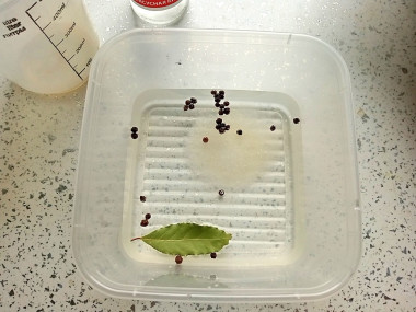 Выложите морковь с маслом и специями в миску к рыбе. Добавьте душистый перец, лавровые листья и аккуратно перемешайте.