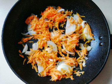 На сковороду с разогретым растительным маслом выложите лук и морковь