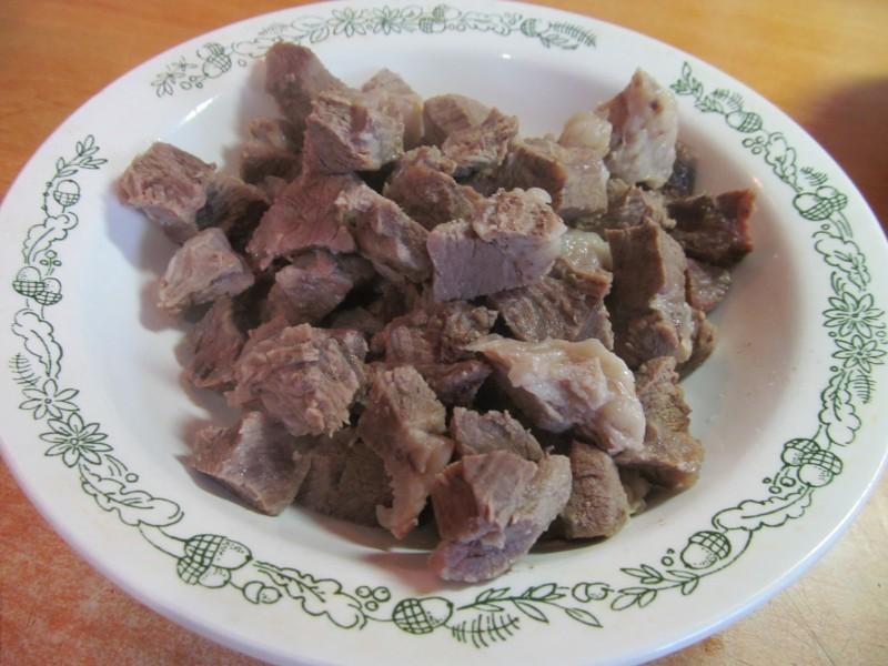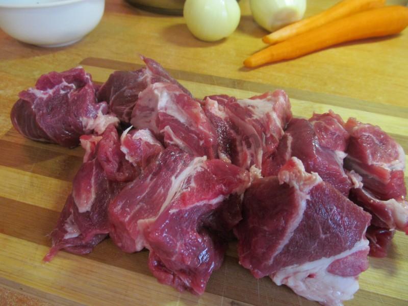Говядину (или баранину) крупно нарежьте.