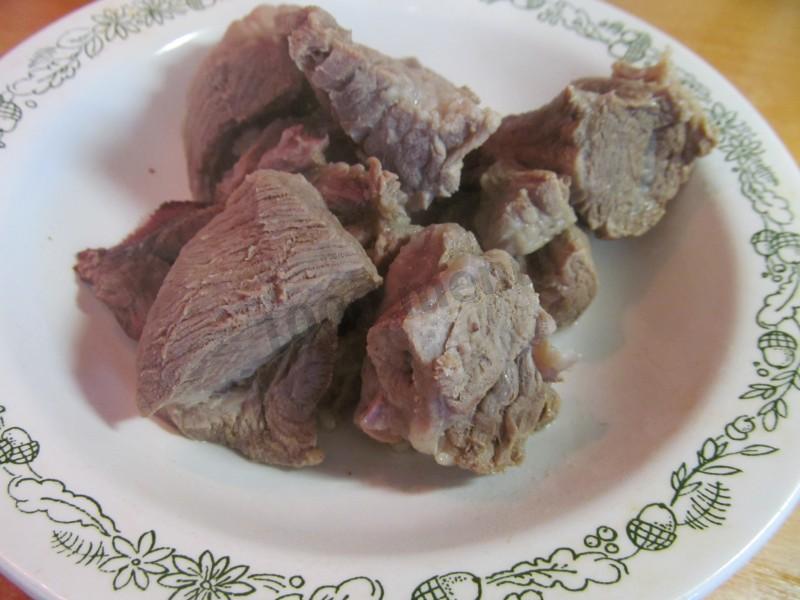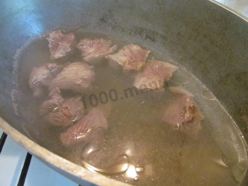 Мясо залейте 1 л воды, доведите до кипения, снимите пену, убавьте огонь и варите около 30 минут до полуготовности.