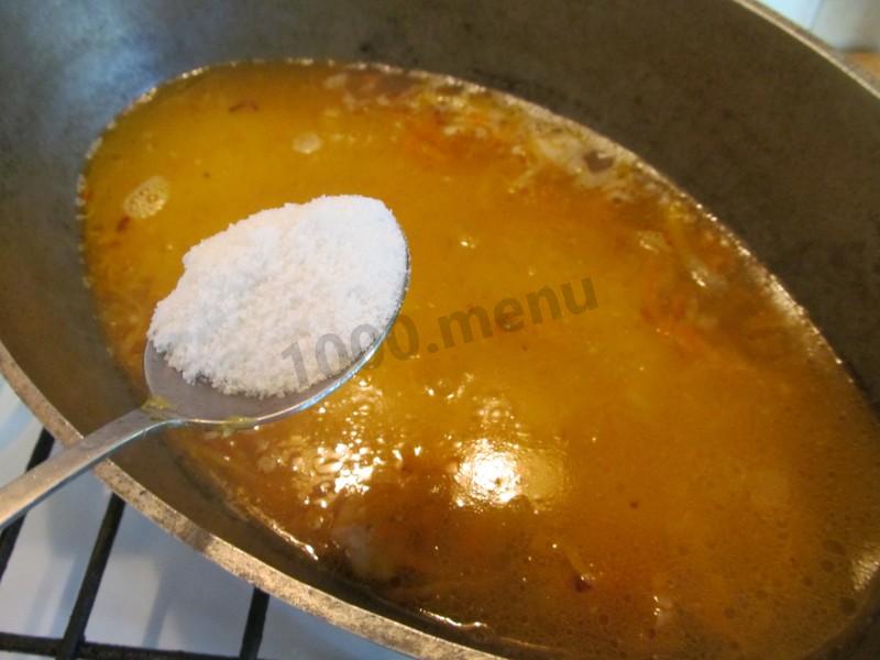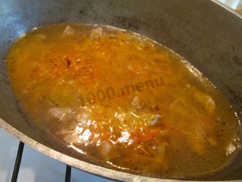 Возвратите в бульон нарезанное мясо, добавьте обжаренные овощи,заложите промытый рис
