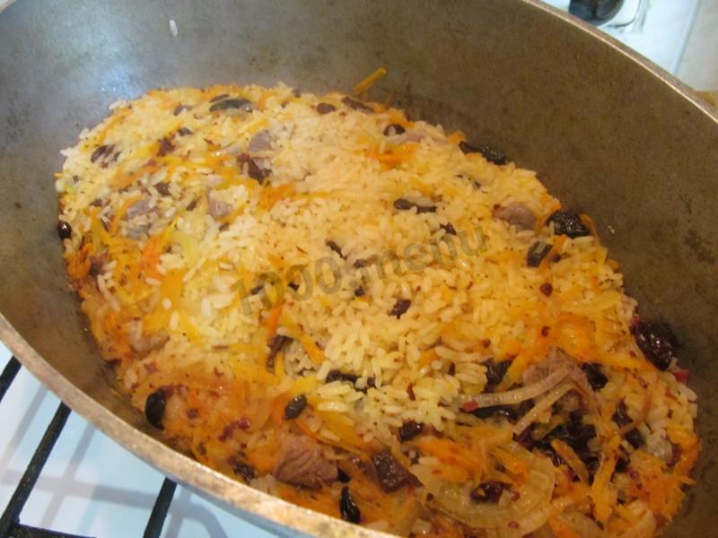 Добавила к мясу обжаренные морковь и лук, промытый рис, немного бульона, соль. Из специй взяла сушёный базилик. Изюм в плов не добавляла.
