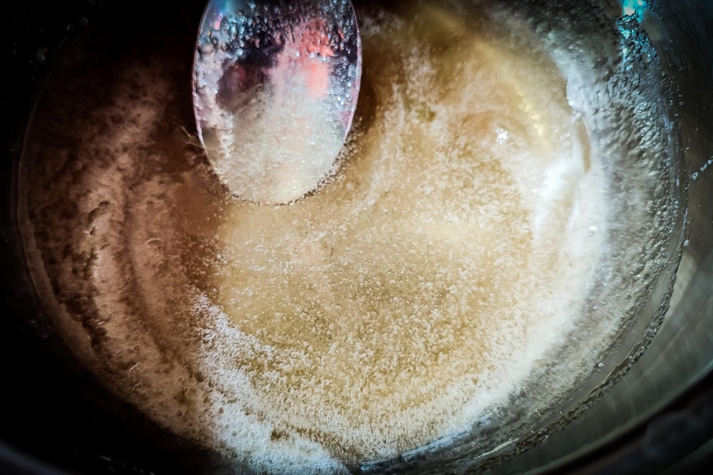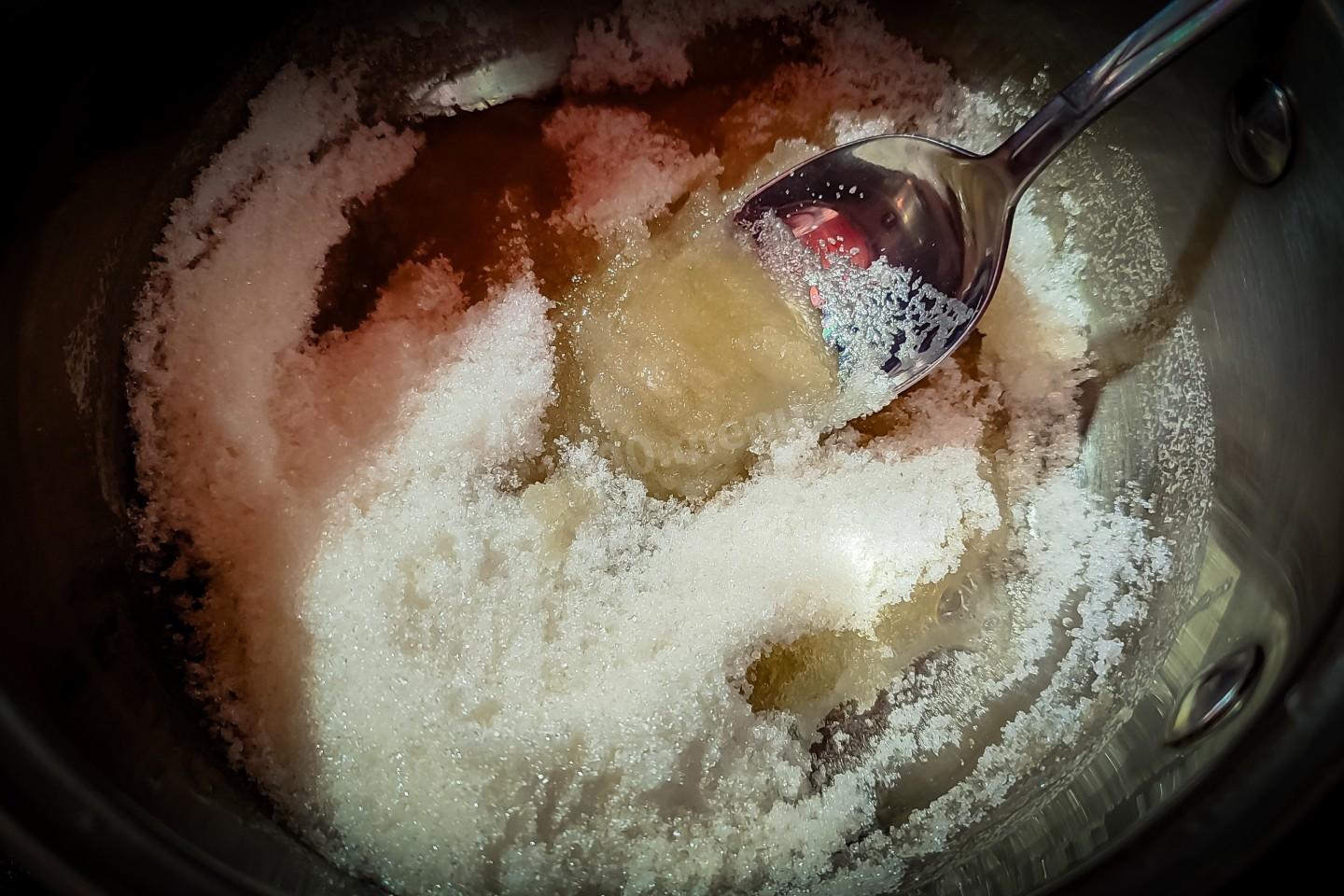 Теперь в кастрюлю всыпать сахар и варить до полного его растворения. Пока растворяется примемся за вторую часть блюда.