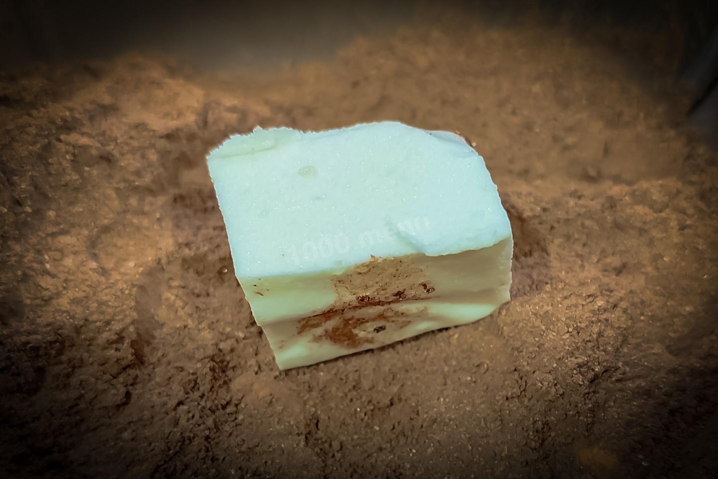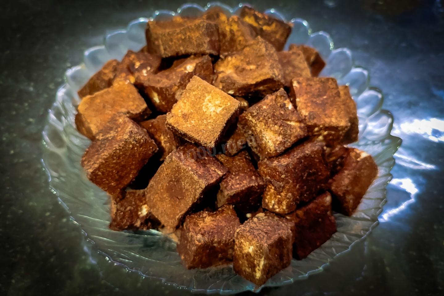 Полученные кусочки обвалять в какао порошке и поместить снова в холодильник.