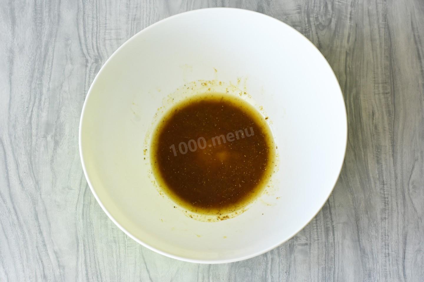 В миске соедините растительное масло, лимонный сок, хмели-сунели, сухой чеснок, соль и перец. Все тщательно взбейте вилкой до однородности. Можете добавить свои специи по вкусу.