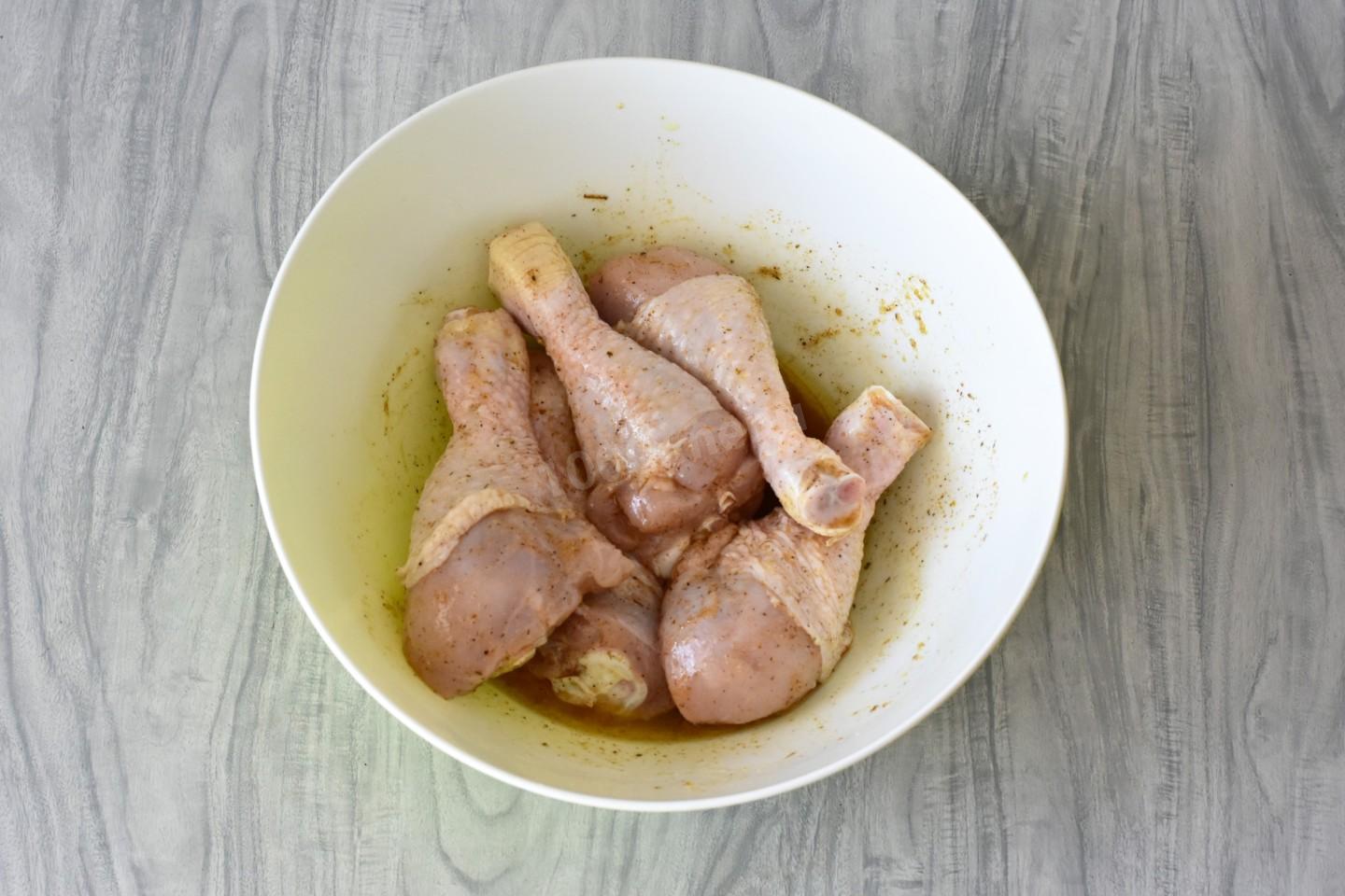 Выложите куриные голени в миску с маринадом и тщательно перемешайте. Поставьте в холодильник на 1 час и периодически перемешивайте, чтобы курица равномерно промариновалась.