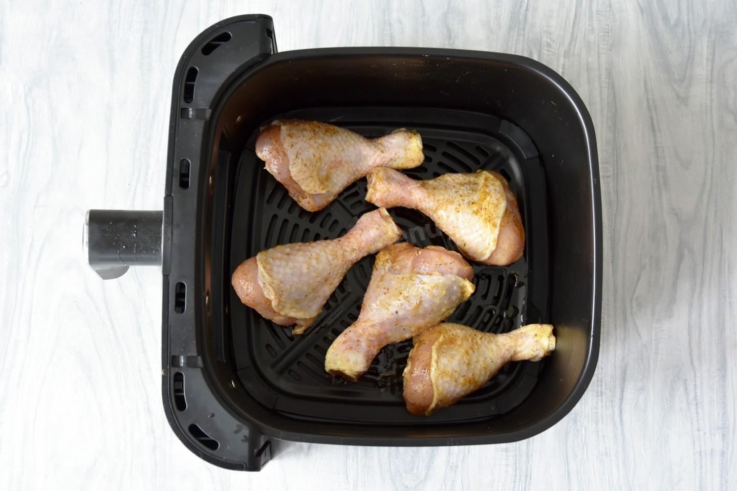 Включите аэрогриль разогреваться. При какой температуре запекать куриные ножки в аэрогриле? Выставите 200 градусов. Куриные бедра выложите на решетку. По желанию можете использовать сложенный вдвое лист пергамента, силиконовую или алюминиевую форму для запекания. Можете одновременно с курицей приготовить в аэрогриле гарнир, например запечь картошку целиком или кусочками.