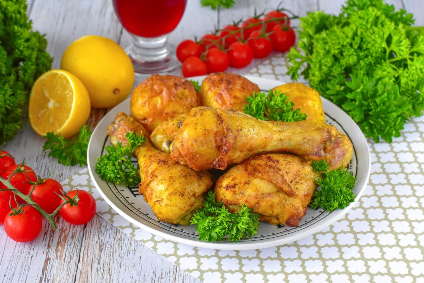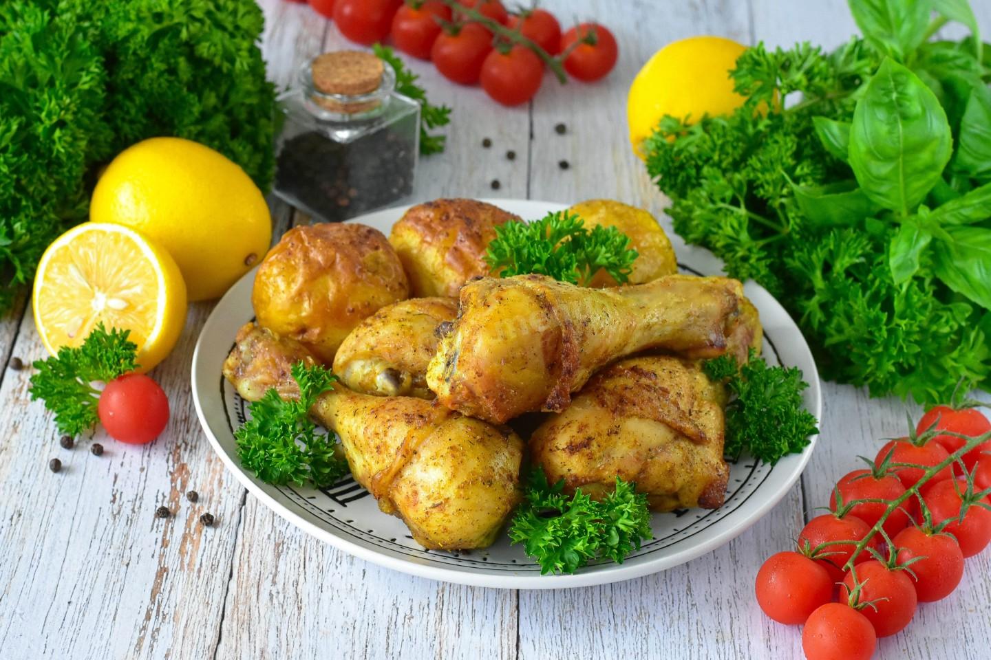 Куриные голени, приготовленные в аэрогриле, переложите на тарелку и подайте к столу с любым гарниром. Я подавала с запеченной картошкой. Приятного аппетита!