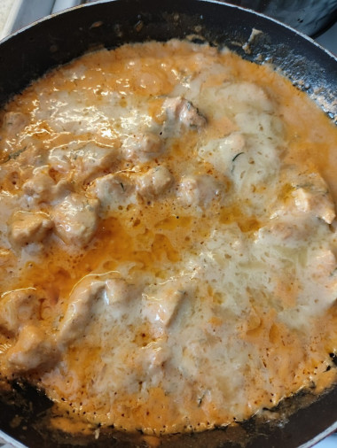 Твердый сыр натрите на средней терке и посыпьте курицу в соусе сверху, перемешайте. Закройте сковороду крышкой и держите ее на огне, пока сыр не расплавится. На это уйдет примерно 3-4 минуты. Подавайте на стол.