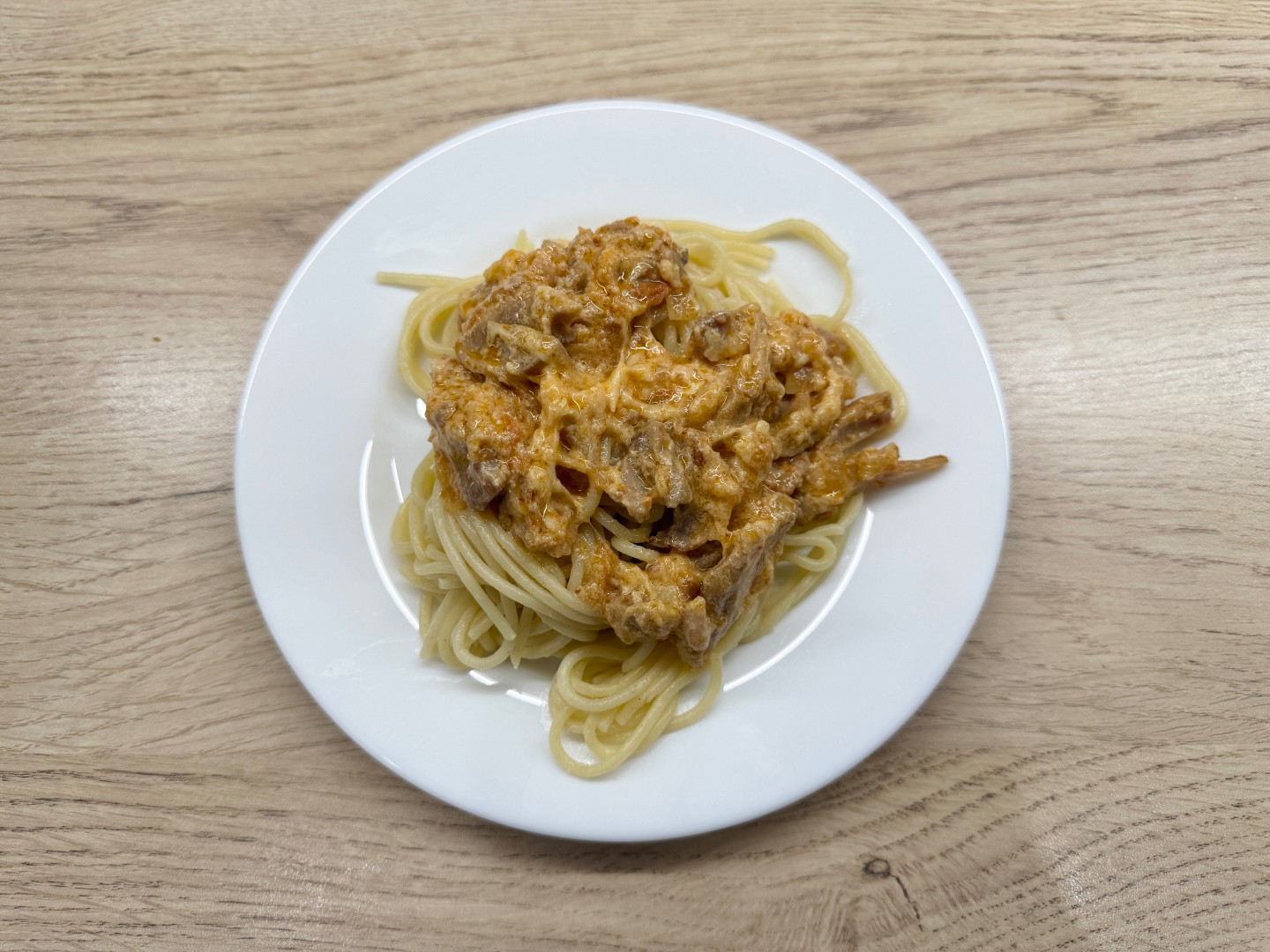 Я готовила с гарниром (спагетти), но вполне можно подавать как самостоятельное блюдо.