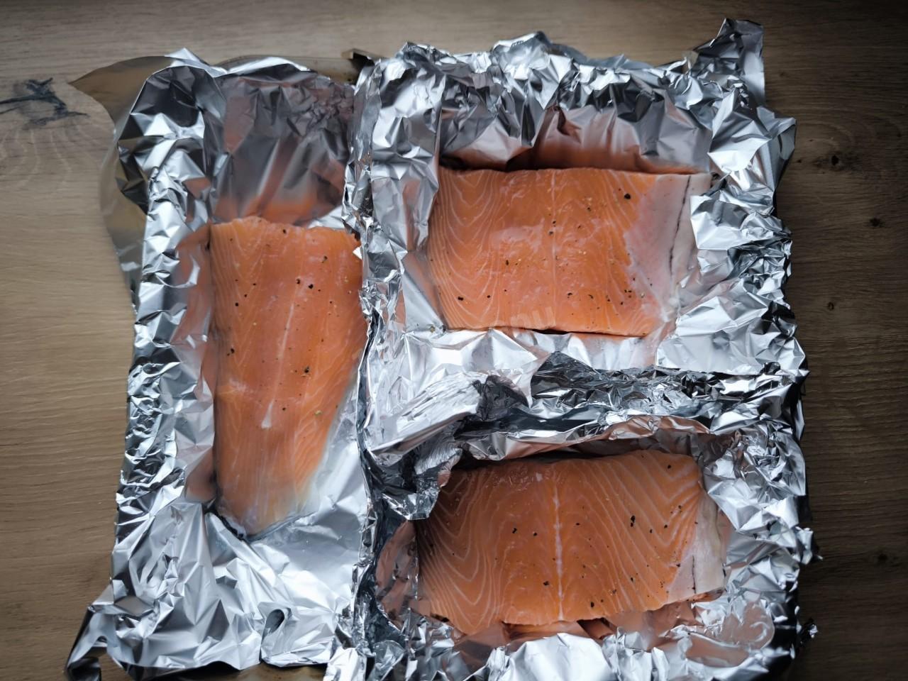 Разрезаем на порционные кусочки, в моем случае на три, и заворачиваем в фольгу. Можно завернуть каждую порцию отдельно, а можно все вместе. Кладем в форму пригодную для запекания в духовке. Солим, перчим по вкусу. Сбрызгиваем лимонным соком.