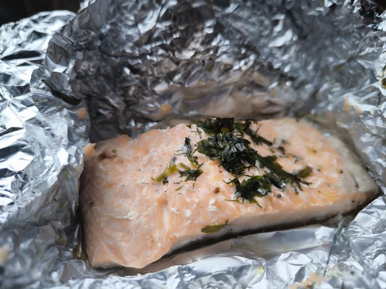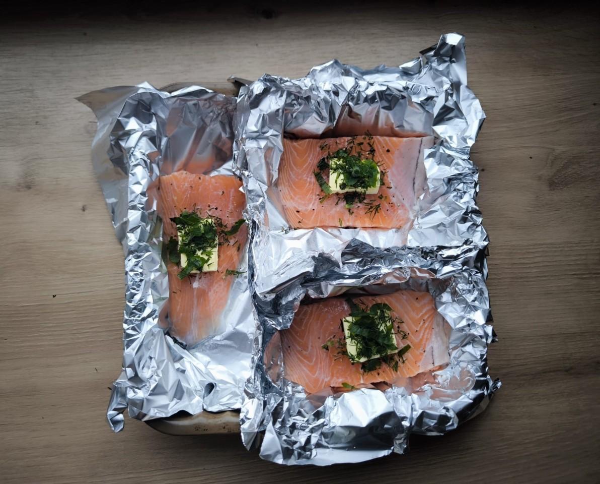 На каждую порцию рыбы кладем кусочек сливочного масла, сверху свежую зелень, любую на ваш вкус. В моем случае это немного укропа и петрушки. Если нет свежей- можно использовать сухую смесь прованских трав. Заворачиваем фольгу и отправляем в разогретую духовку.