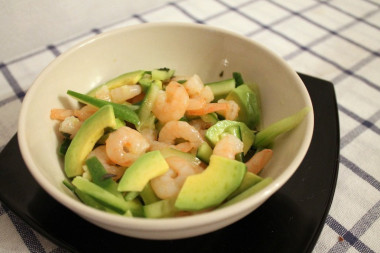 Креветки разморозила на сковороде, довела их до готовности. Авокадо и манго нарезала ломтиками. Все ингредиенты смешала в салатнике и заправила соусом. Салат получился очень вкусным! Необычный, со сладкими медово-манговыми нотками. Моя семья такой салат оценила.
