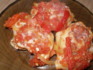 Затем обжарьте сначала лук, добавьте к нему помидоры и перец и тушите в течение десяти минут на огне умеренного размера.