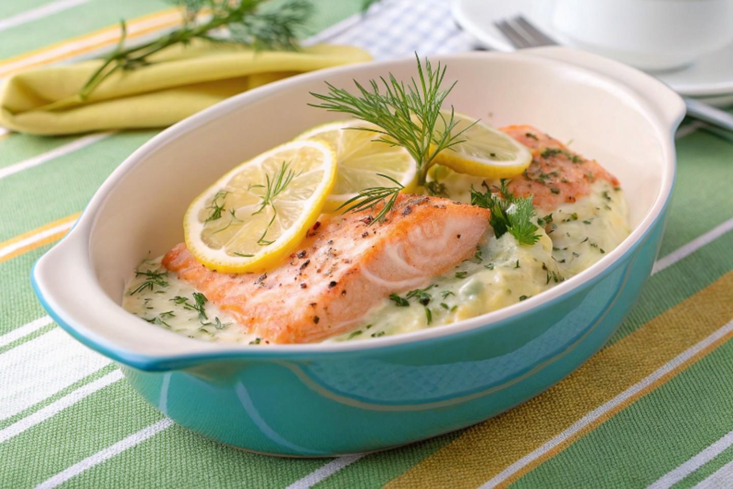 Смешайте в миске сметану с луком, чесноком, укропом, посолите и поперчите по вкусу. Вы можете добавить (или убрать) любые специи, например, паприку или горчицу, ориентируйтесь на свой вкус. Под рецептом вы найдёте статью о специях, которые идеально сочетаются с рыбой.