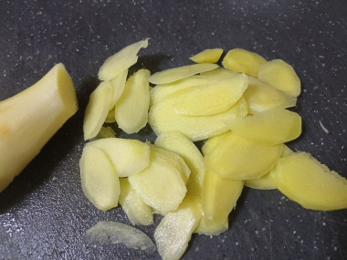 Корень имбиря тщательно промываем и очищаем, а затем нарезаем тонкими ломтиками по 2-3 мм.