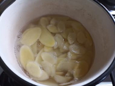 Затем имбирь перекладываем в емкость для варки, заливаем водой, доводим до закипания и сливаем воду.