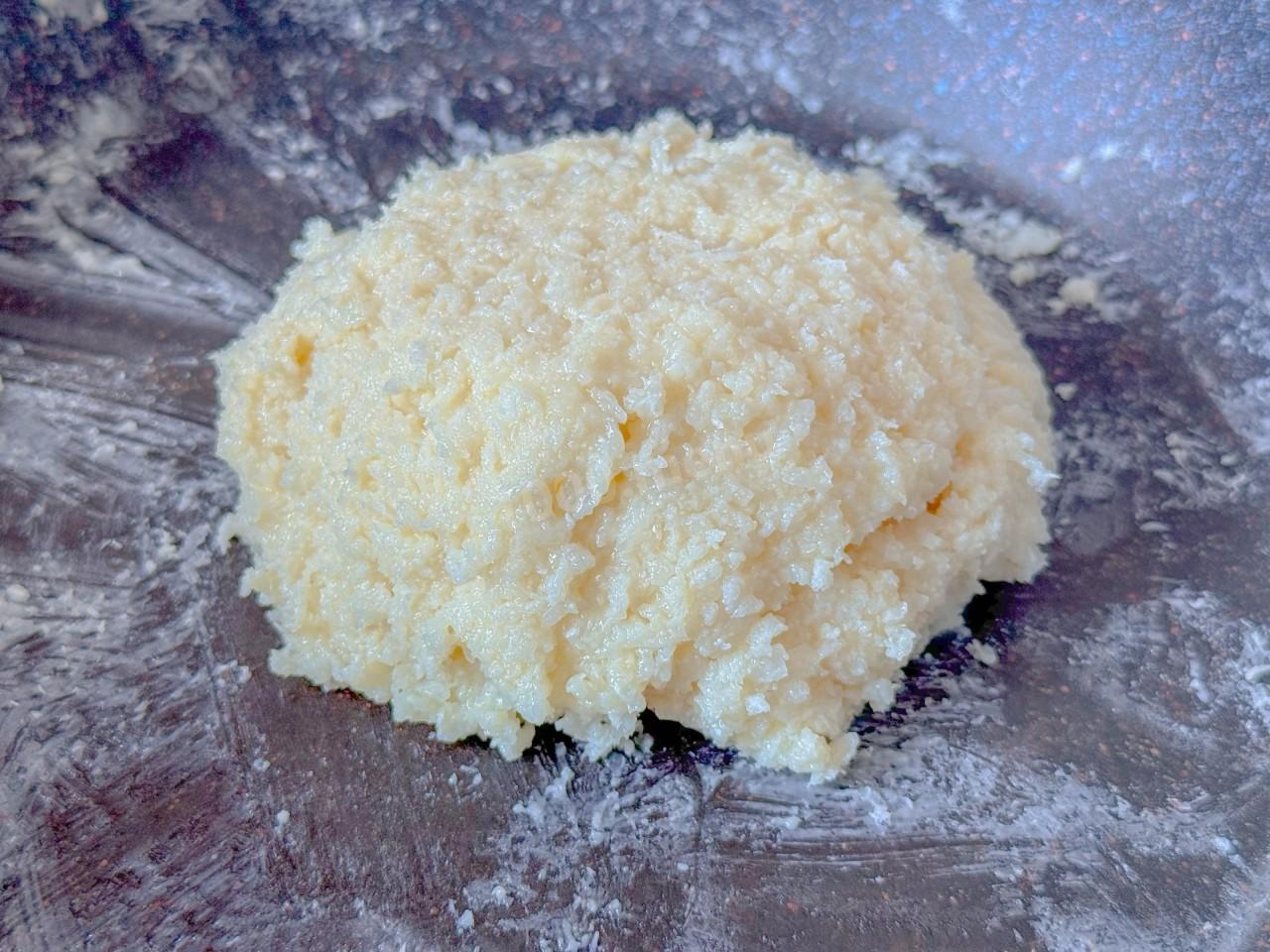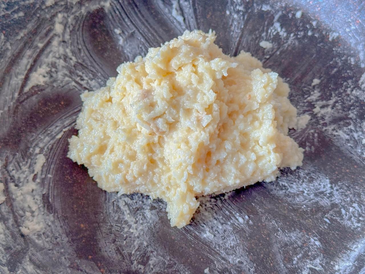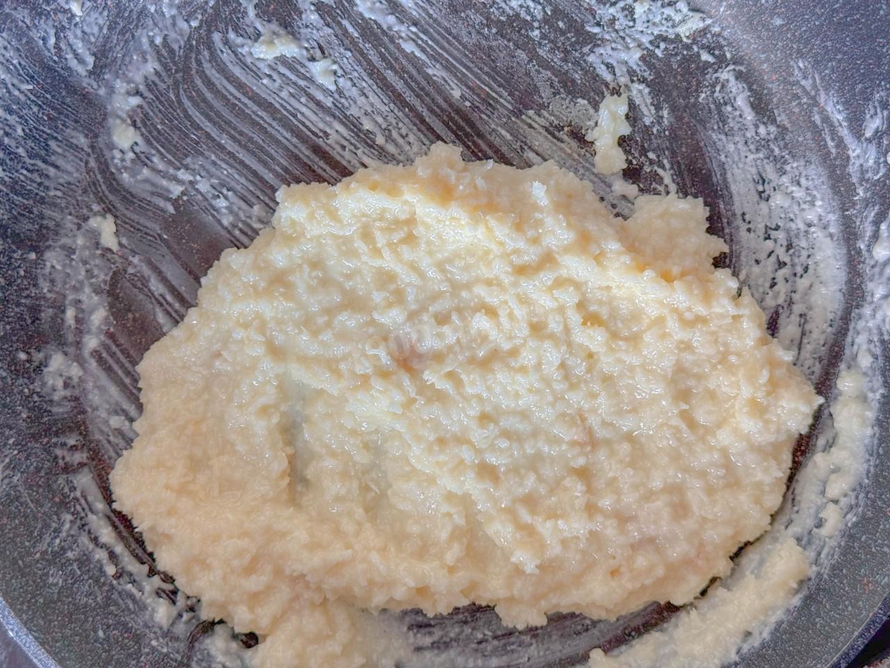 Уберите сковороду с огня. Масса должна легко собираться в оформленный комок, пласт. Остудите массу любым способом: оставьте в сковороде или переложите в тарелку и уберите в холодильник на 5-10 минут. Я остужала в тарелке при комнатной температуре в течении 15 минут.