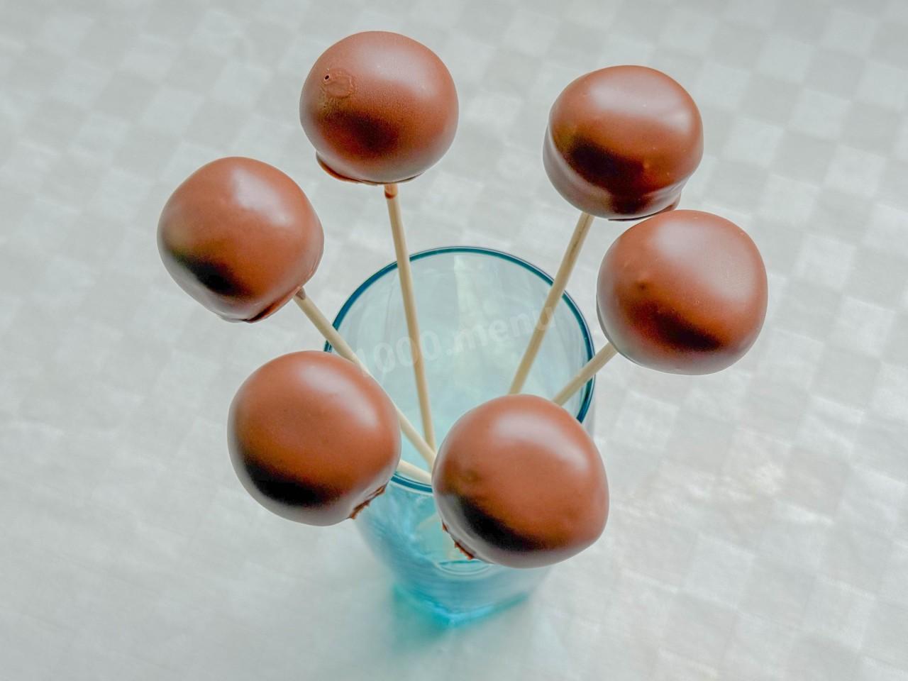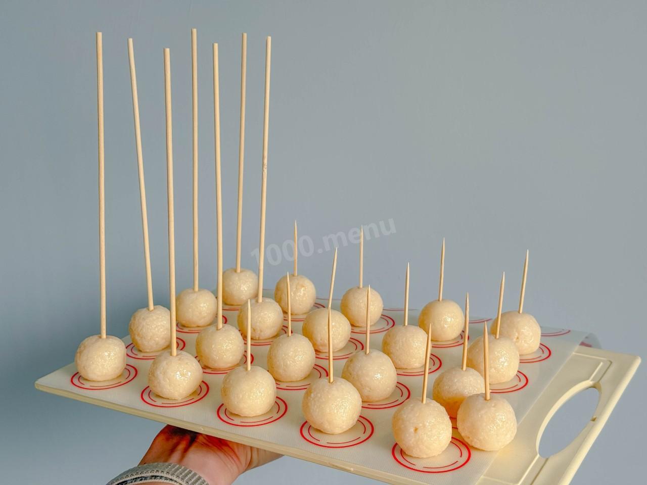 Вставьте шпажки или зубочистки в будущие конфетки. Вставляйте палочки до середины конфеты и глубже, чтобы при покрытии глазурью они не выпали со шпажек. Отправьте в морозильную камеру на 10-30 минут.