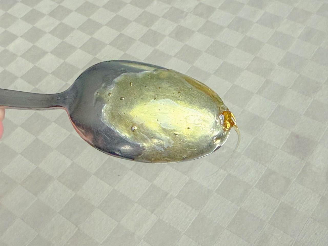 Карамель с ложки не должна стекать. Получается сладкий леденец - петушок. При ударе с другой ложкой или твердым предметом - карамель должна трескаться.