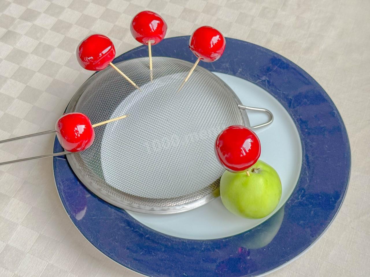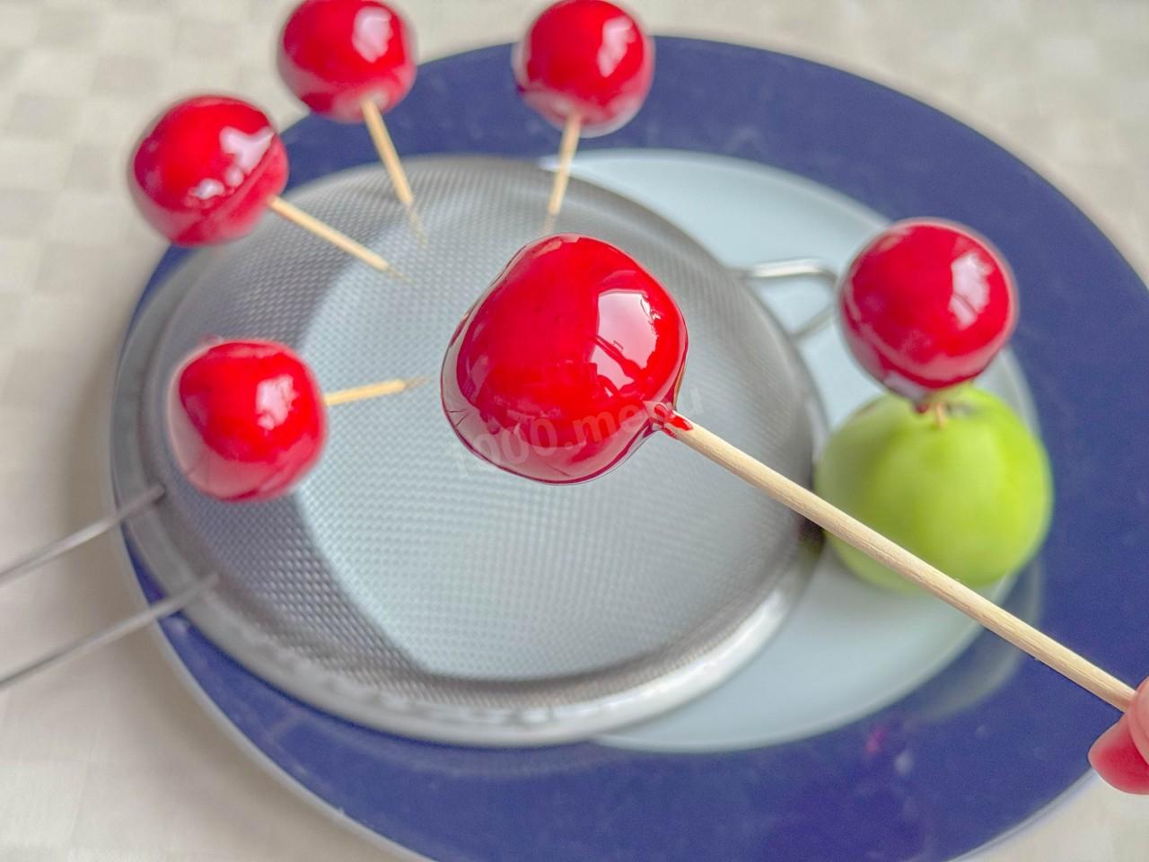 Работайте быстро, так как карамель быстро застывает. Готовые конфеты до застывания воткните в пенопласт, в дуршлаг, яблоко, или поставьте в стакан.