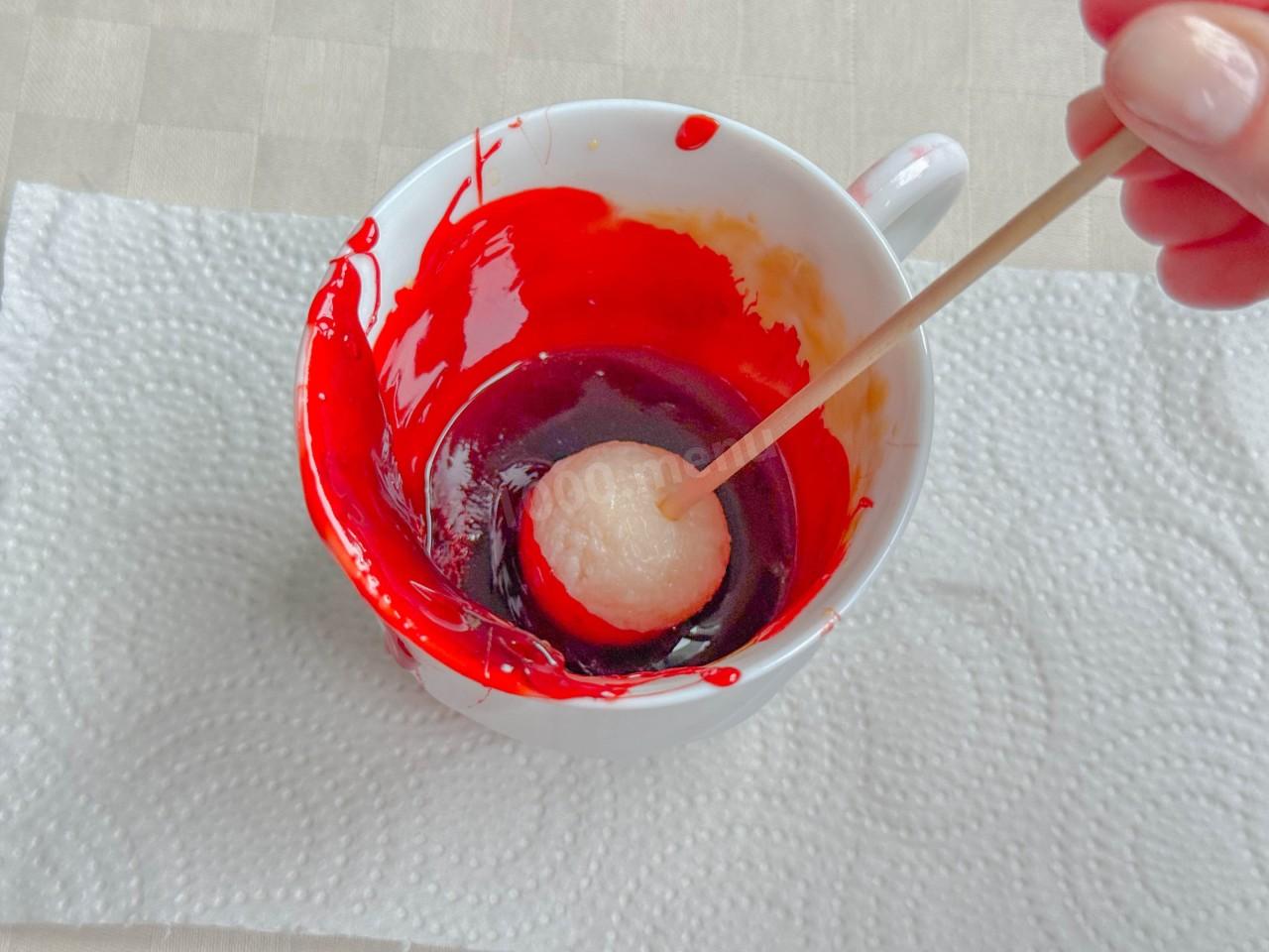 Достаньте из морозилки часть ледяных конфет. Каждую конфетку окуните в карамель и прокрутите на шпажке/зубочистке, чтобы карамель равномерно распределилась и ушел "хвостик".