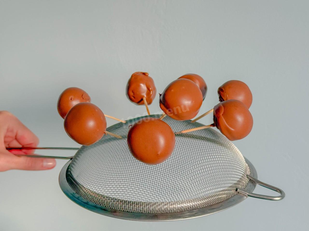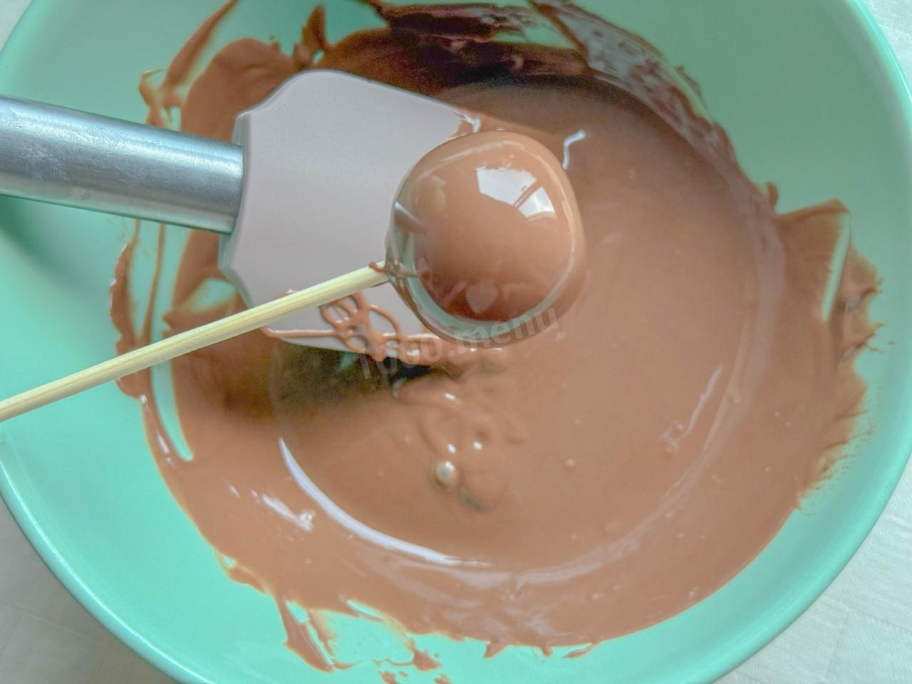Ледяные конфетки окунайте в шоколад, прокручивайте и стучите слегка о край тары, чтобы шоколад быстрее стекал. Шоколад переодически остывает от холодных конфет. Поэтому, его следует переодически подогревать (в микроволновке, на водяной бане).