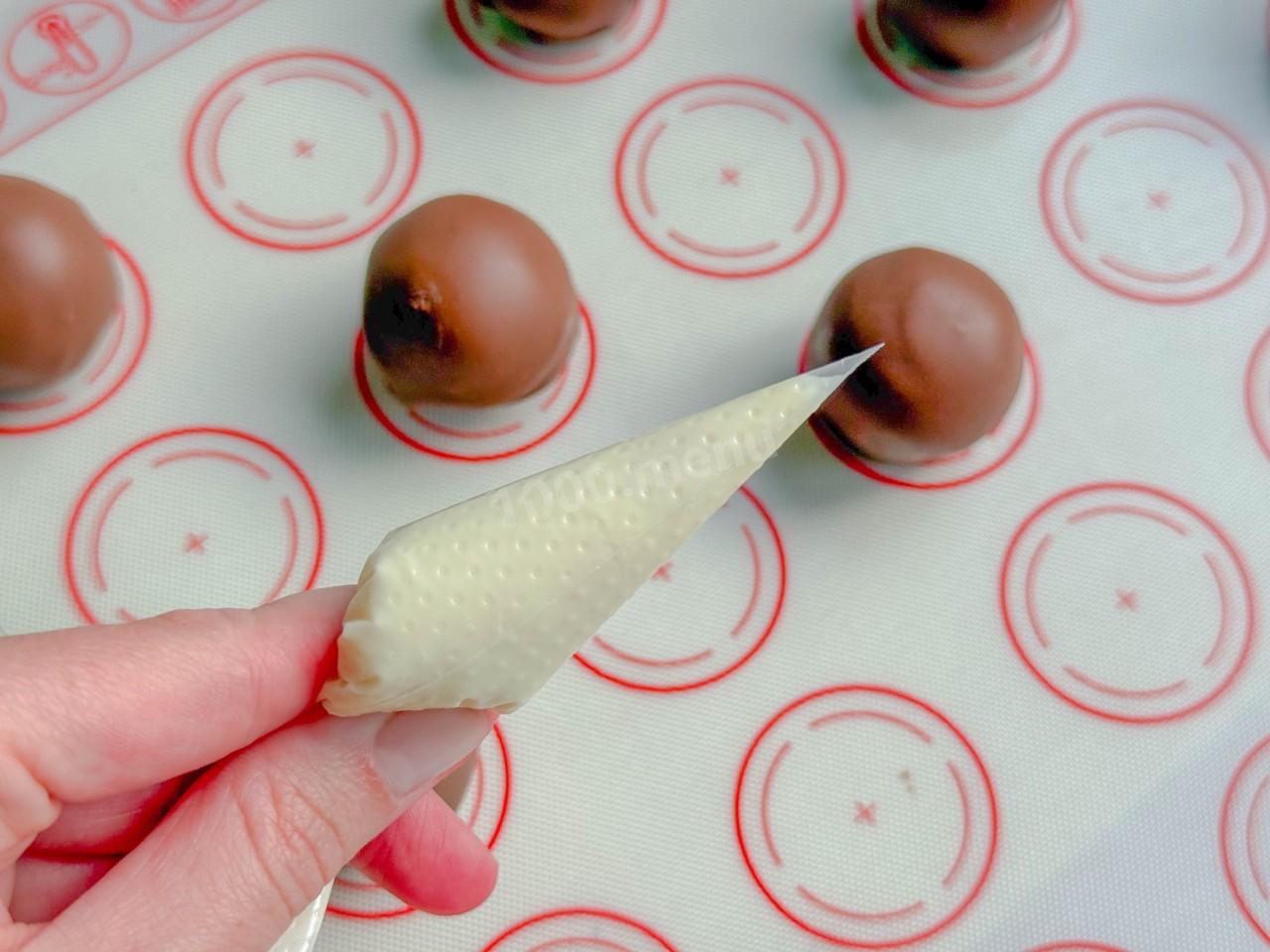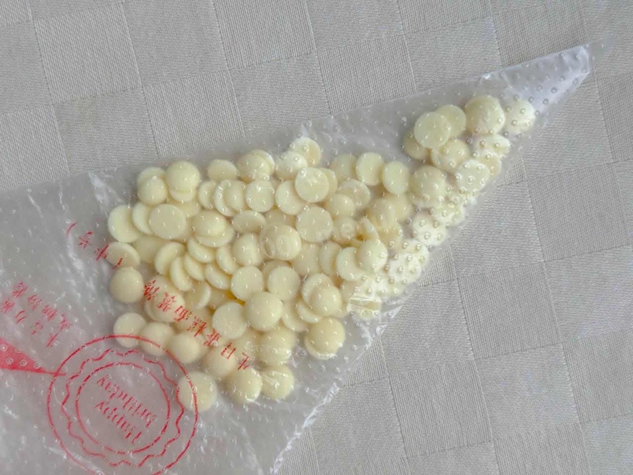 Для украшения поместите белый шоколад в кондитерский мешок или край пакета.