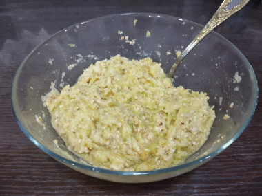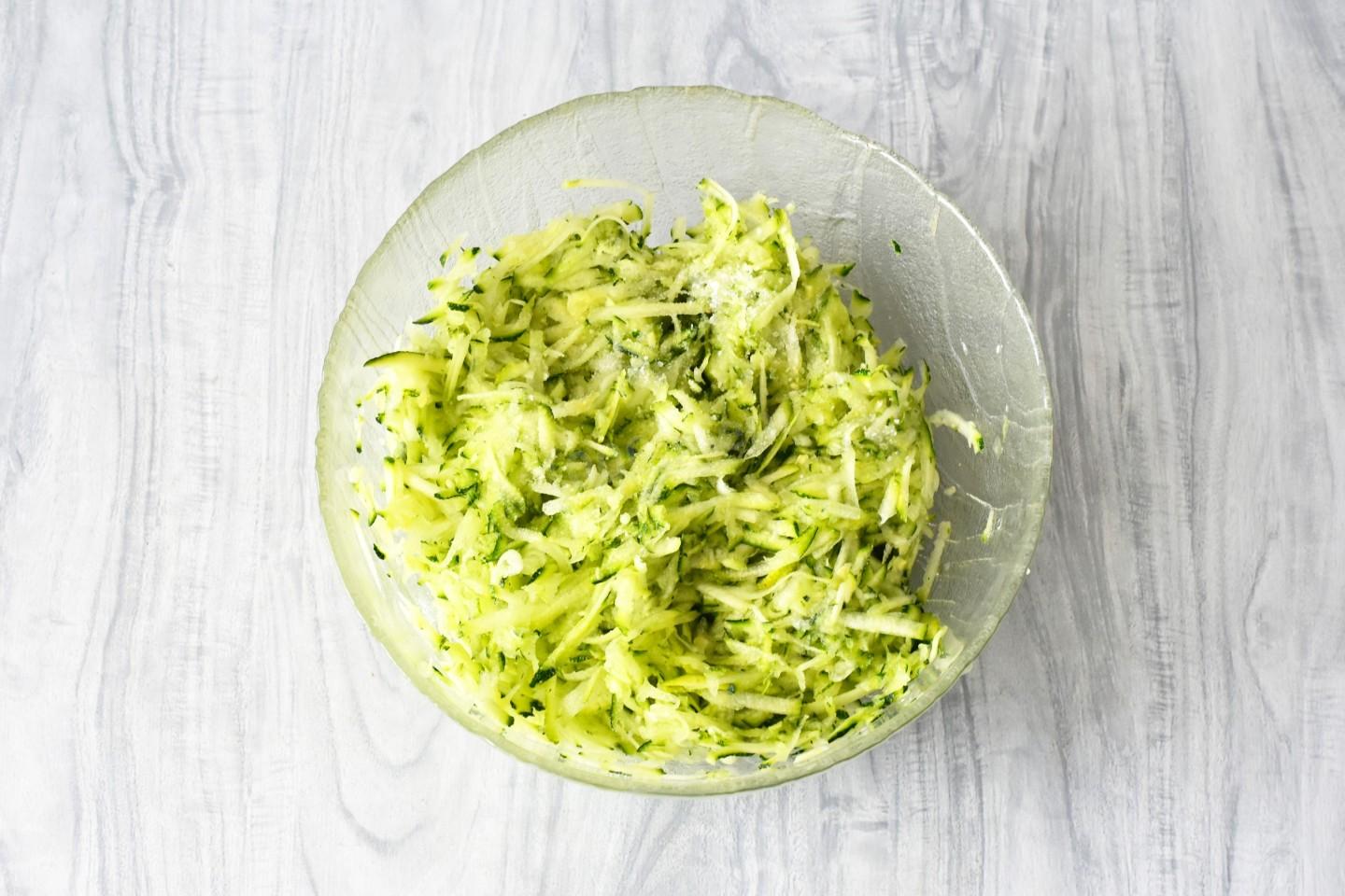 Кабачок тщательно промойте со щеткой. Если кабачок молодой с нежной кожицей и мелкими зернышками, то очищать его не нужно. Если кабачок крупный, перезрелый, с жесткой твердой кожицей и крупными семенами, то его нужно очистить и от кожицы, и от семян. У меня был молодой цуккини. Кабачок натрите на крупной терке, посолите и оставьте на 10 минут, затем отожмите и слейте выделившийся сок.