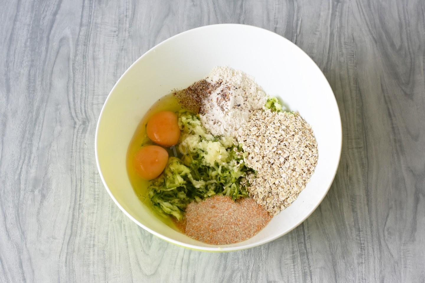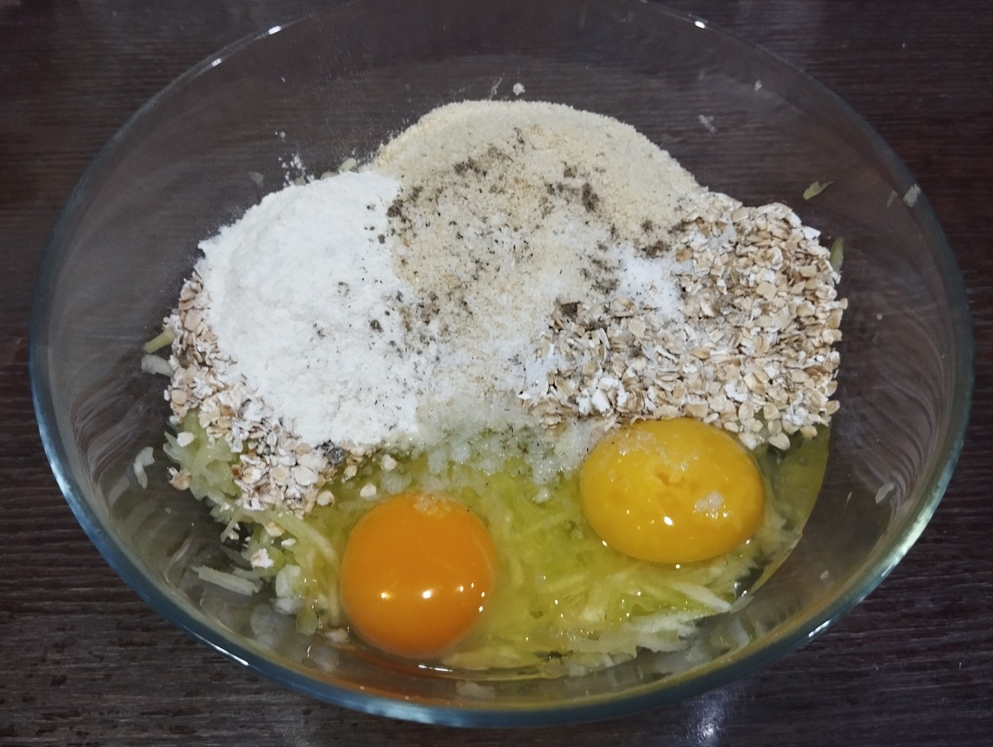 В миске соедините лук, отжатые кабачки, яйца, овсяные хлопья, панировочные сухари, муку, соль и перец.