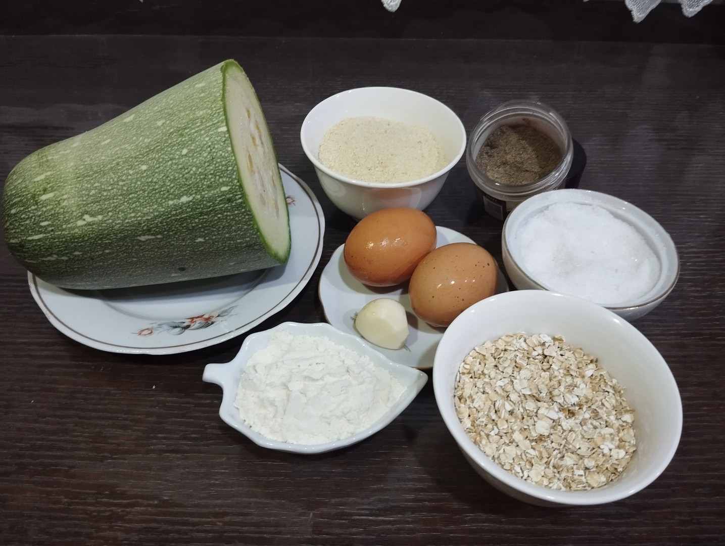 Как сделать кабачковые котлеты с овсянкой и чесноком? Для начала подготовьте необходимые ингредиенты по списку. У меня овсянка среднего помола. Можете использовать хлопья другого помола по вашему вкусу. Как выбрать овсянку, читайте в статье по ссылке в конце рецепта.