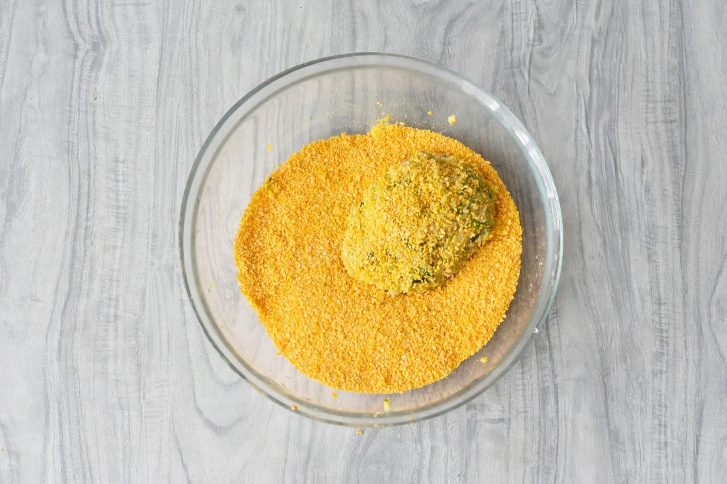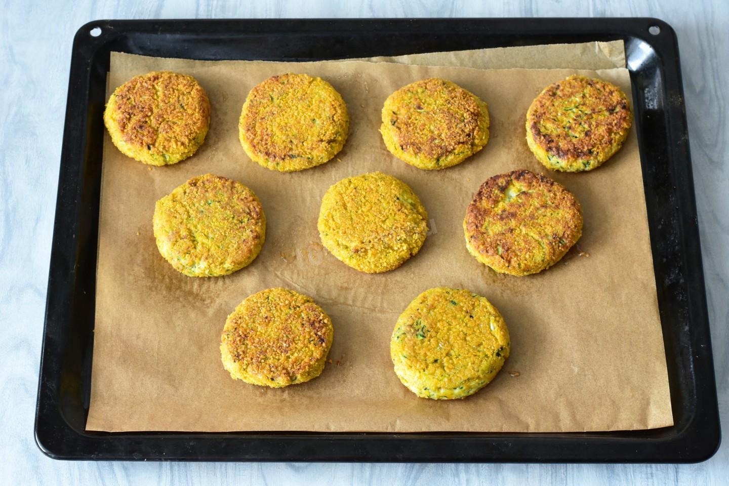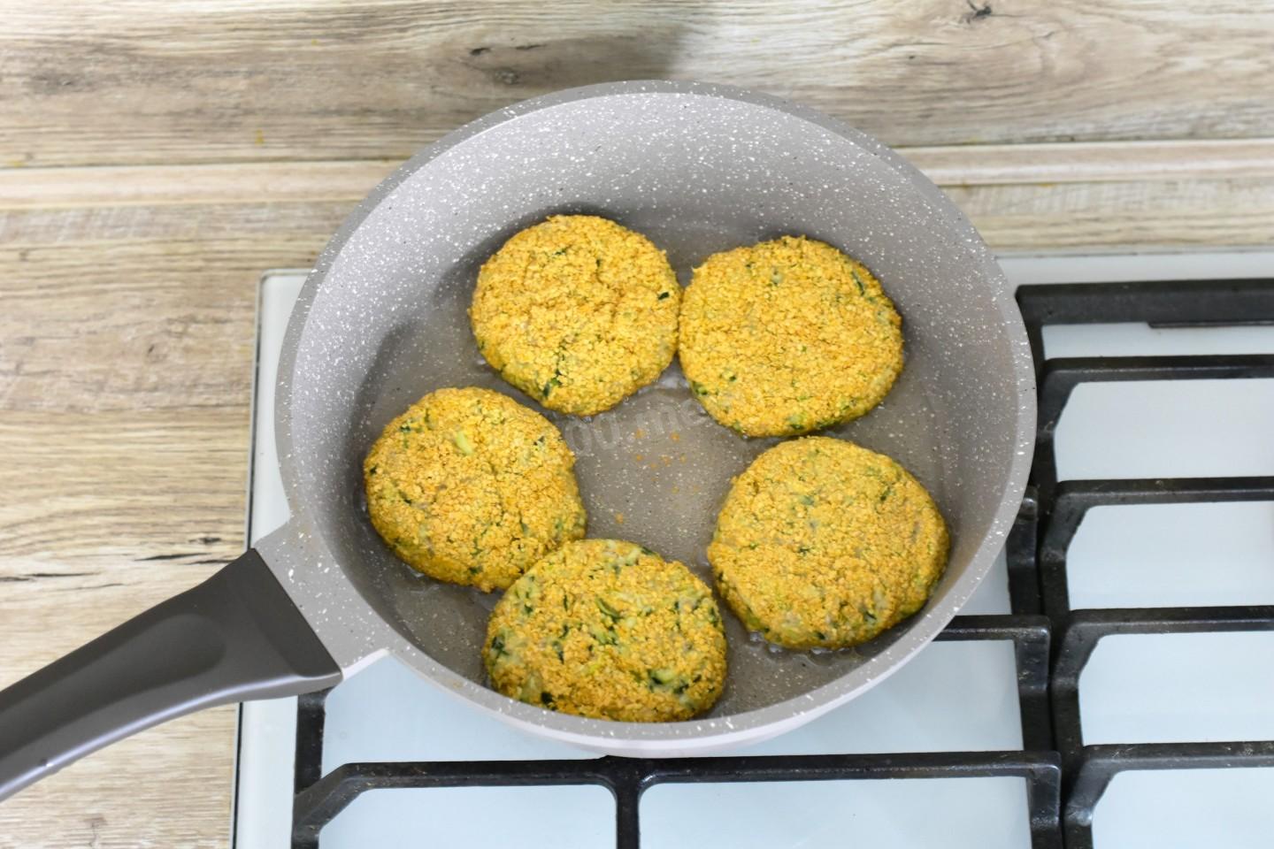 Из кабачковой массы сформуйте ровные круглые котлетки небольшого диаметра и обваляйте их в панировочных сухарях.