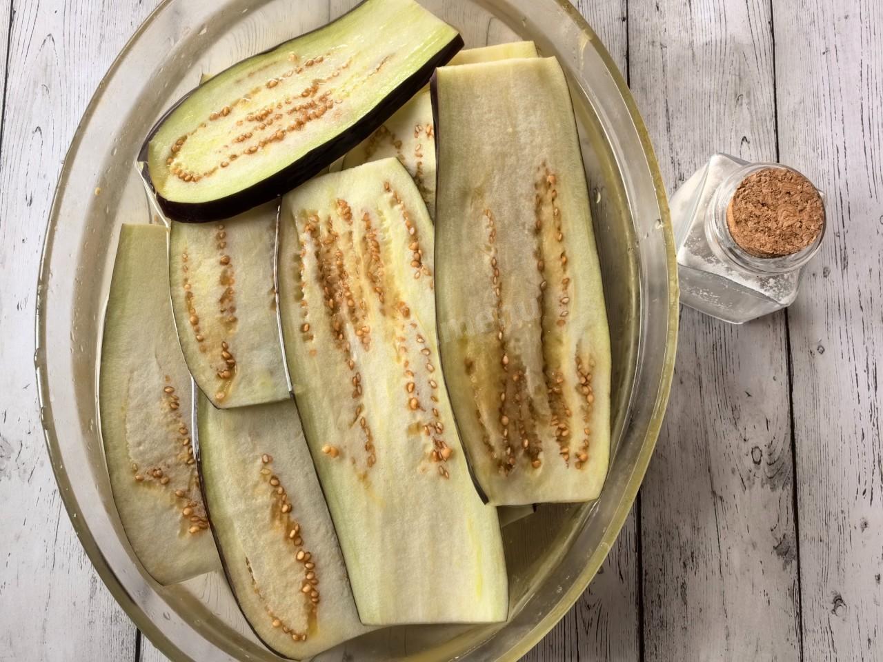 Баклажаны помойте и нарежьте ломтиками толщиной 4-6 мм. Далее вымочите ломтики в подсоленной воде, минут 20. Это поможет убрать горечь из баклажанов. После этого обсушите ломтики от лишней влаги.