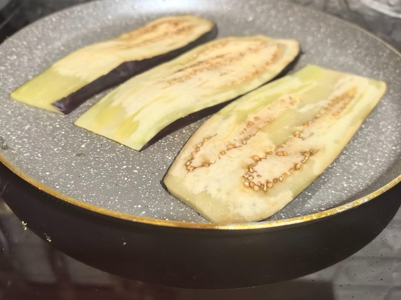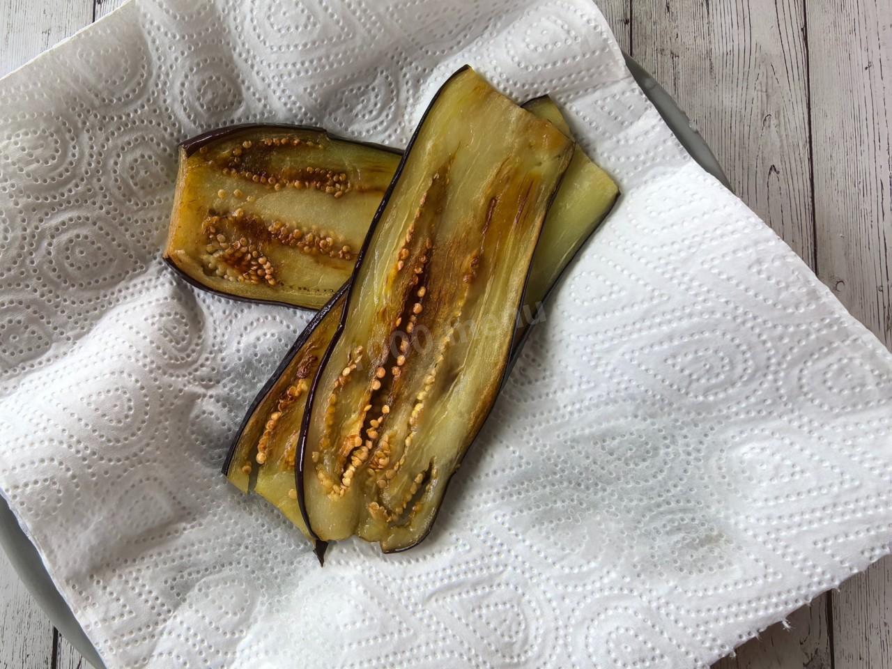 Чтобы блюдо получилось более лёгким и нежным, можно запечь баклажаны в духовке. Выложите ломтики на противень, сбрызните маслом и немного посолите. Запекайте минут 20-25, при температуре 180 градусов. Ломтики станут золотистыми, а серединка мягкой. Время запекания может отличаться. Ориентируйтесь по своей духовке.